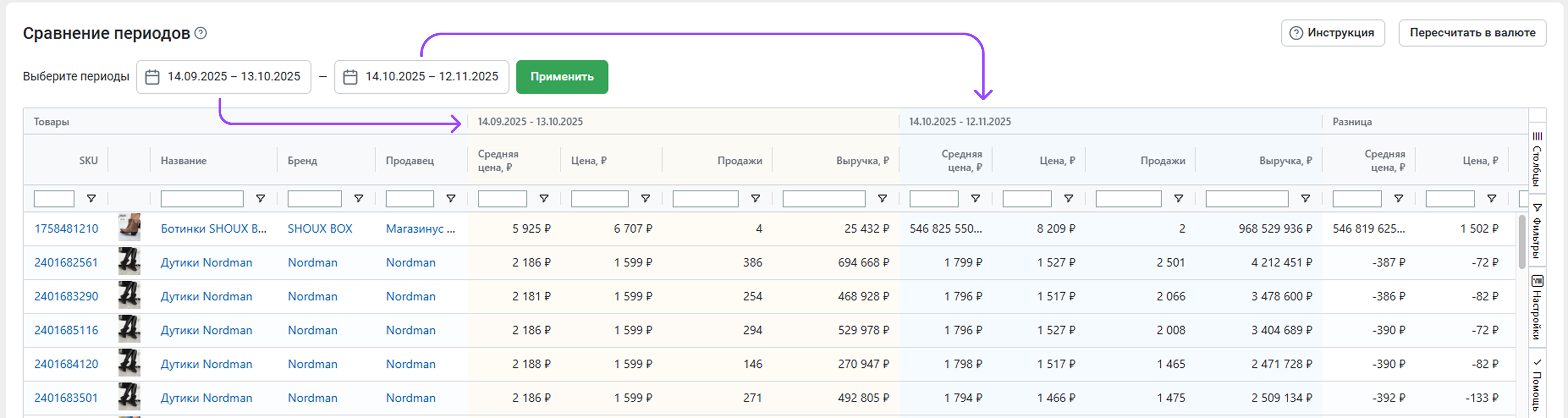 В таблице отражены данные по первому и второму периоду. Вы увидите разницу между ними. Внизу таблицы отображены суммарные значения продаж и выручки за выбранные периоды и разница.