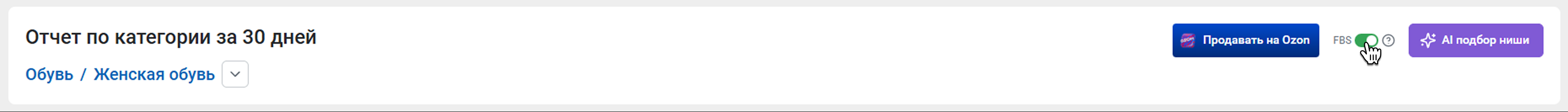 По умолчанию показываем данные только по товарам со складов маркетплейса. Если вы активируете переключатель FBS, статистика по товарам будет отображаться полностью (и по FBO, и по FBS).
