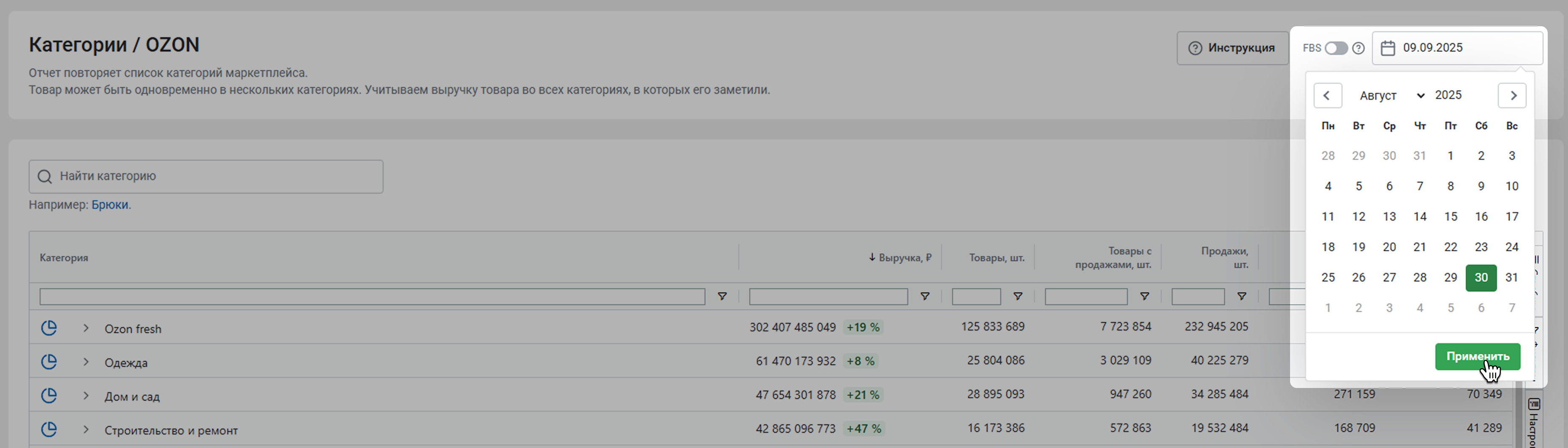Раздел Категории Ozon сервиса MPSTATS — это удобный способ проанализировать целую категорию или подкатегорию.