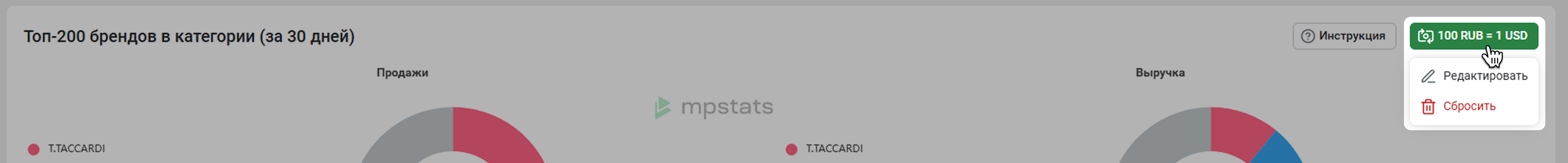 Указанный вами курс отобразится справа над таблицей. Если вы нажмете на него, откроется меню. Нажмите Редактировать, если нужно изменить курс и пересчитать показатели. Чтобы вернуть таблицу к изначальному виду, нажмите Сбросить.