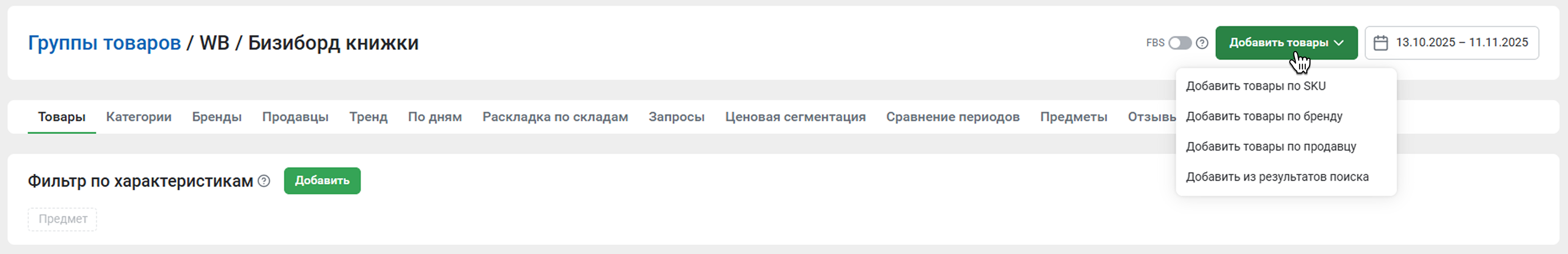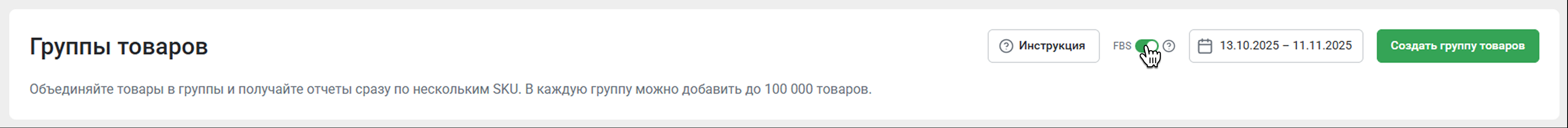 По умолчанию показываем данные только по товарам со складов маркетплейса. Если вы активируете переключатель FBS, статистика по товарам будет отображаться полностью (и по FBO, и по FBS).