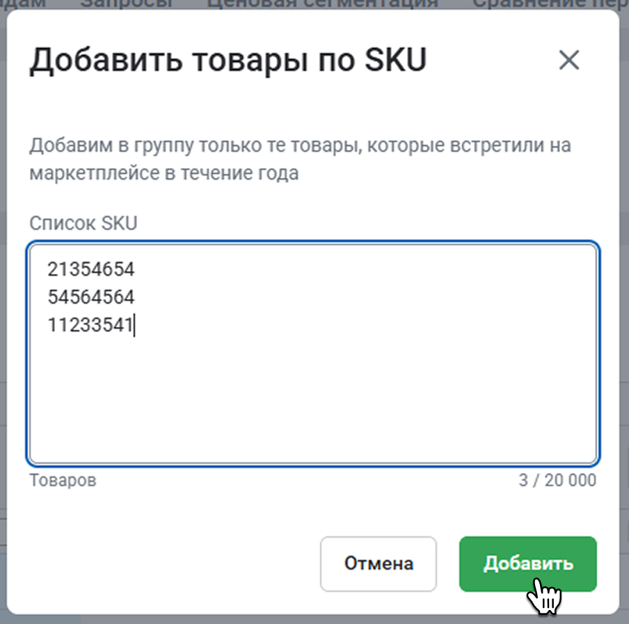 Введите интересующие SKU через пробел, запятую или с новой строки. В одну группу можно добавить до 100 000 товаров. Но за один раз можно добавить не больше 20 000 товаров – количество добавленных товаров указано внизу. Нажмите Добавить.