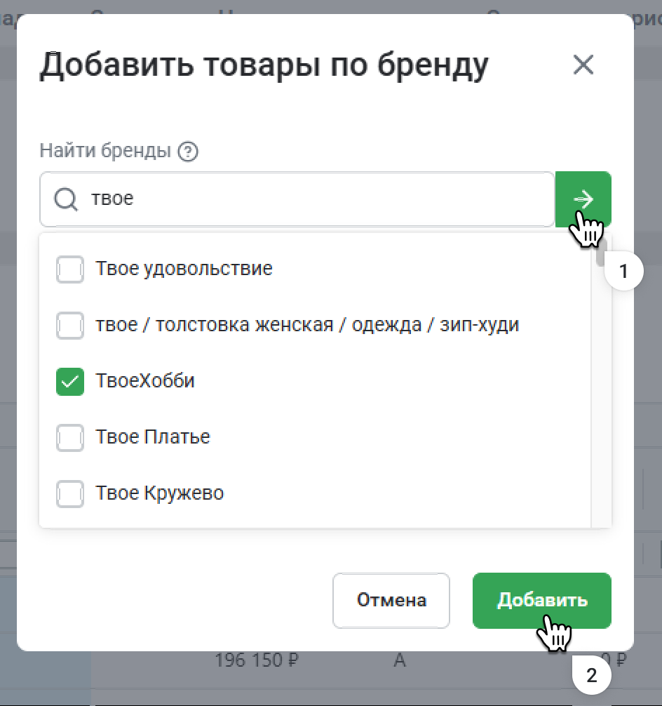 Начните вводить название бренда или введите его целиком. Нажмите на стрелочку или Enter. Система предложит вам подходящие варианты брендов. Отметьте нужные галочками и нажмите Добавить.