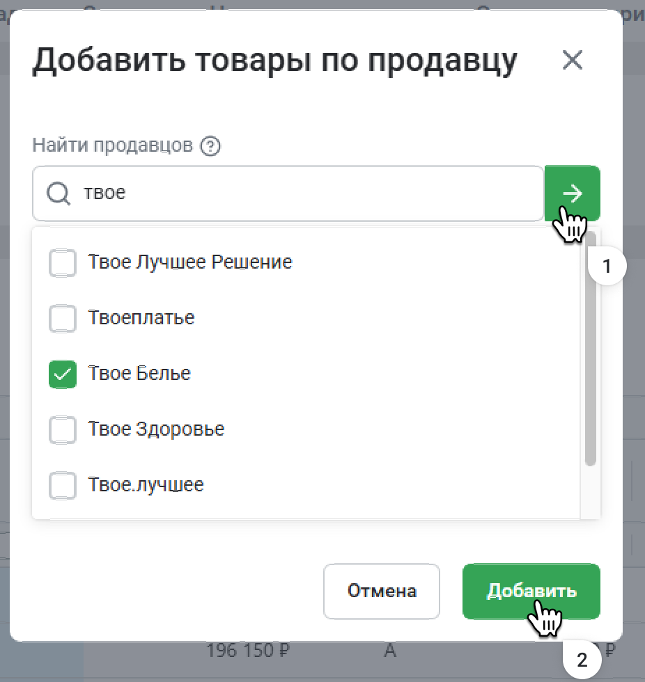 Начните вводить название продавца или введите его целиком. Покажем подходящие под ваш запрос варианты. Отметьте нужных продавцов галочками и нажмите Добавить.