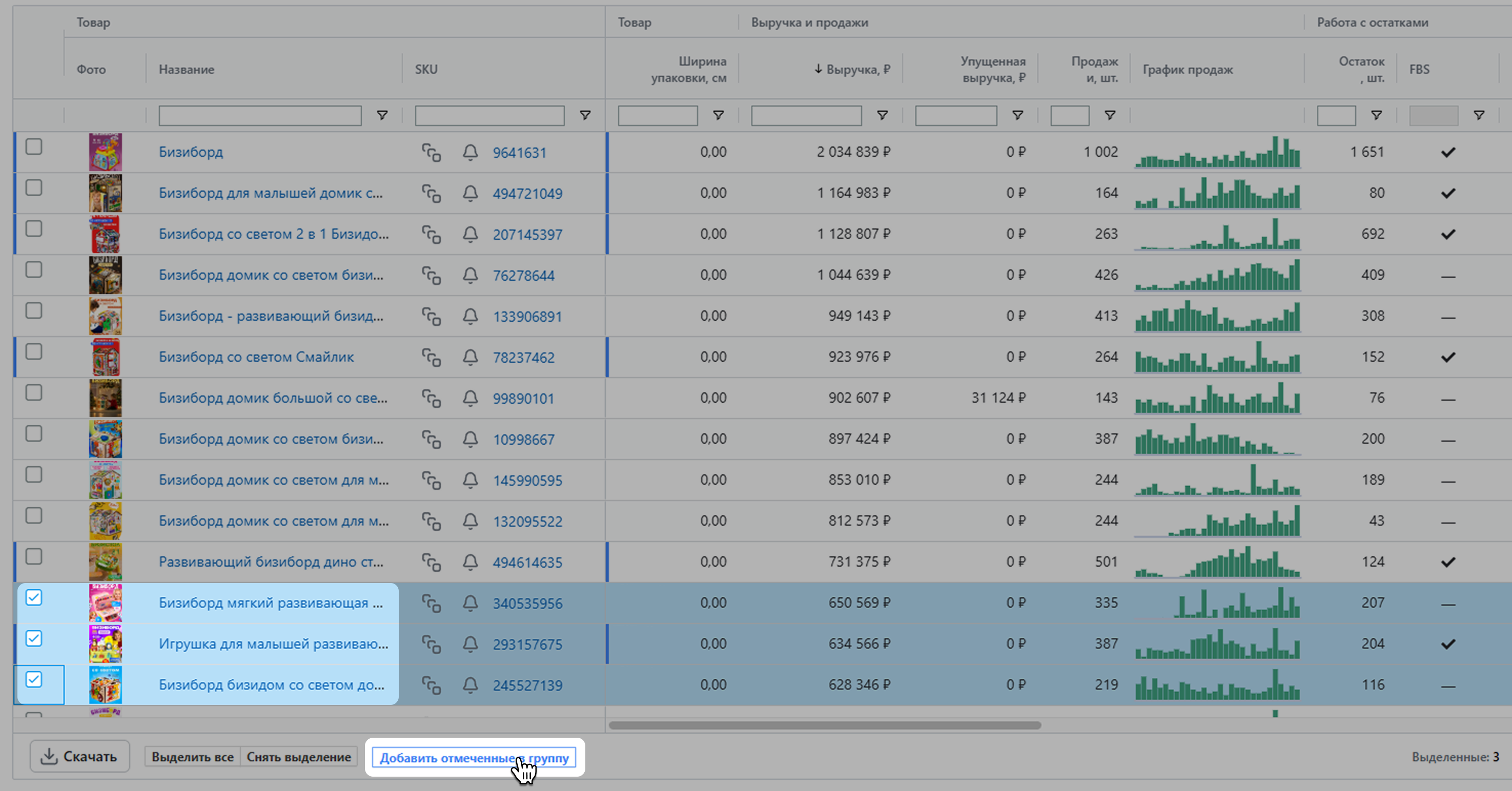 Перейдите в отчет по Категориям, отчет по Продавцу или отчет по Бренду на вкладку Товары. Отметьте галочками товары и нажмите Добавить отмеченные в группу.