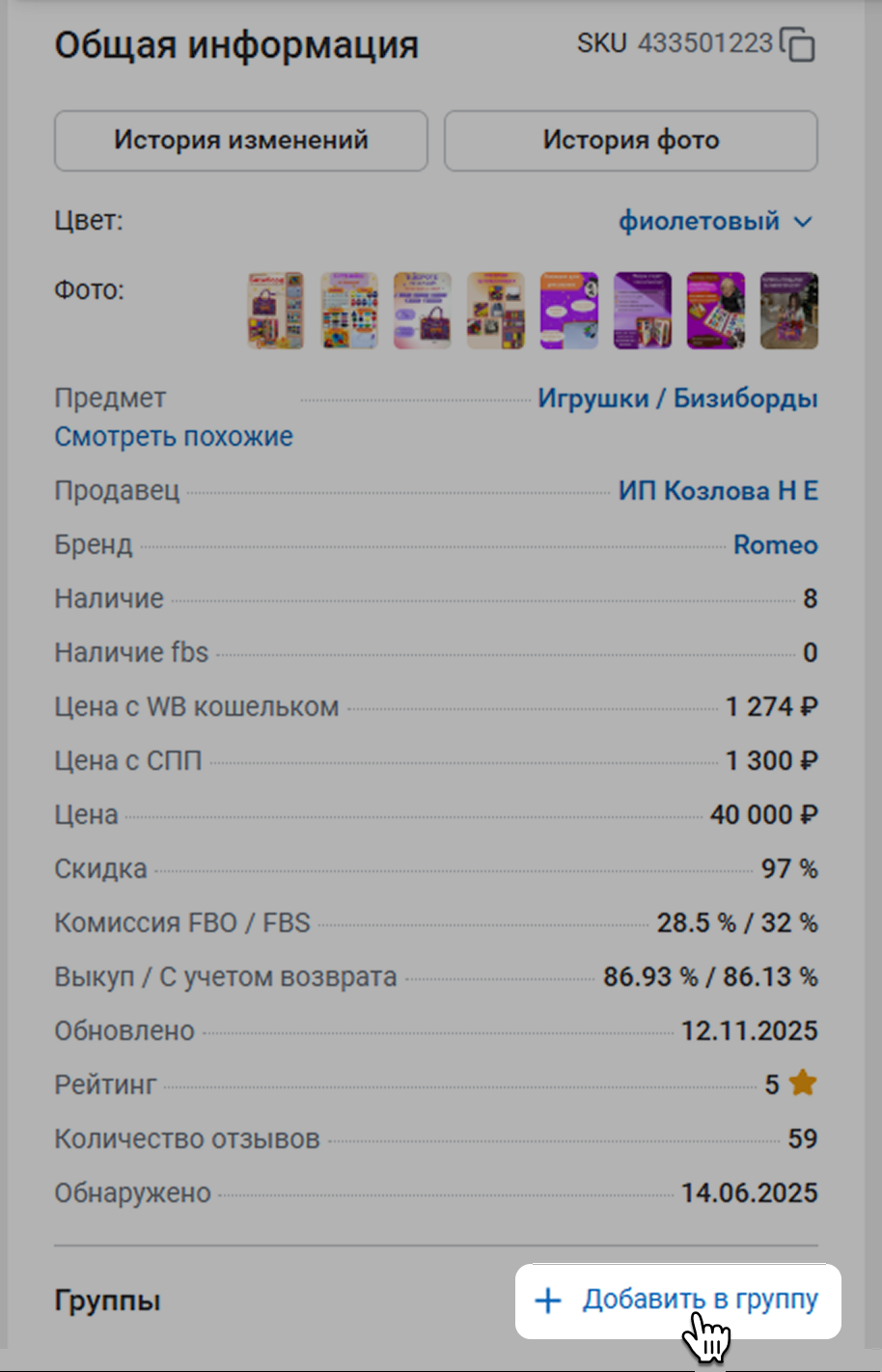 Инструмент позволяет группировать товары, чтобы получать необходимую информацию по выбранным товарам. Например, вас заинтересовали товары конкурентов, но эти товары находятся в разных категориях, и бренды у них разные. Вы хотите отследить динамику этих товаров, чтобы сравнить со своими товарами и скорректировать стратегию продаж. Чтобы каждый раз не искать эти товары, вы можете сгруппировать их и получать информацию в удобном формате. Такой подход оптимизирует время работы с группой товаров.