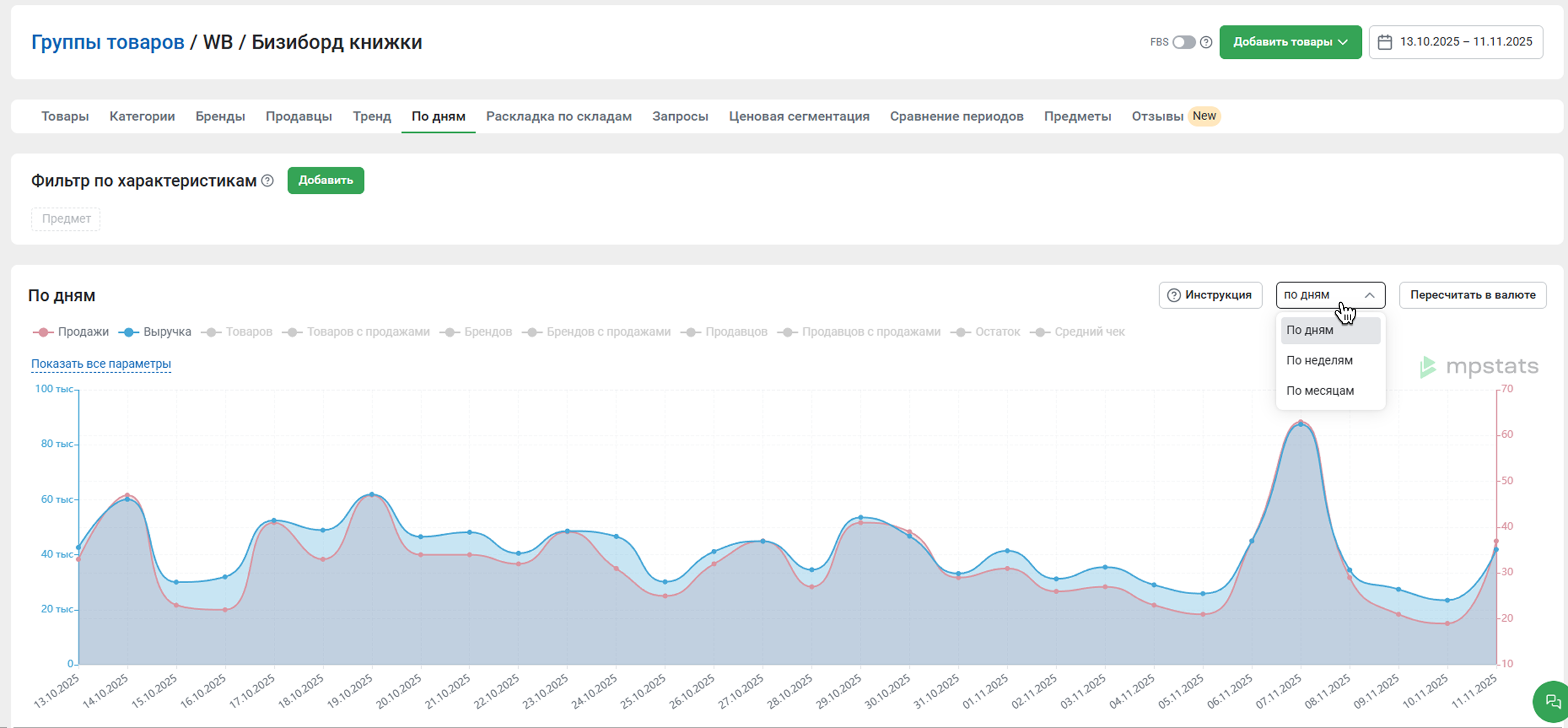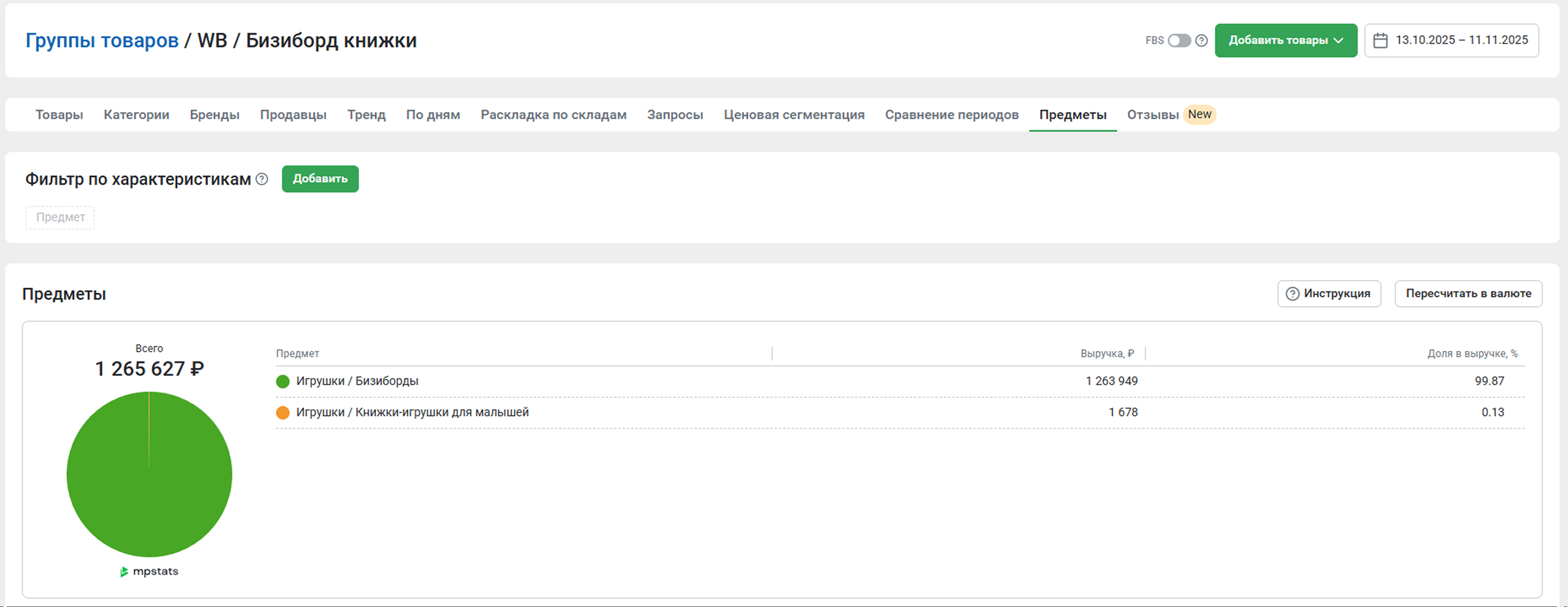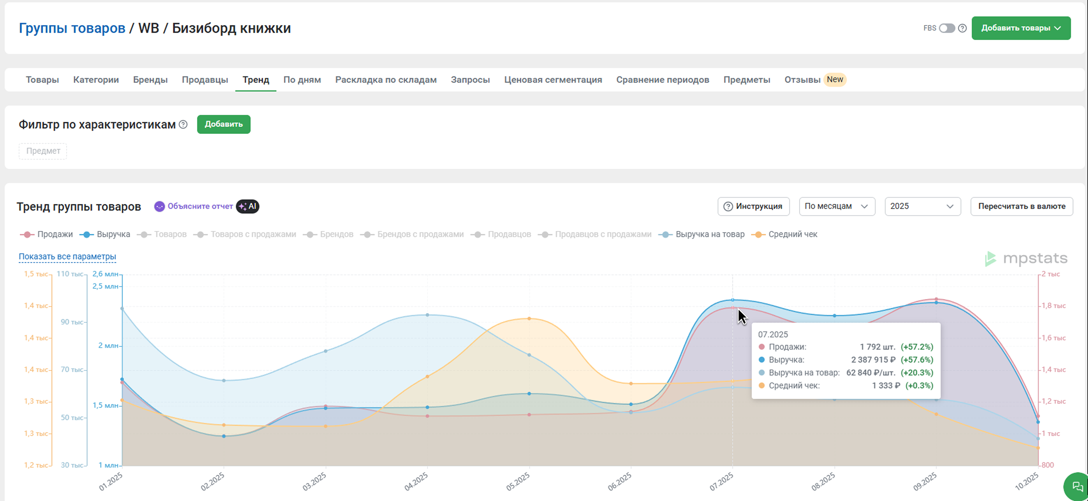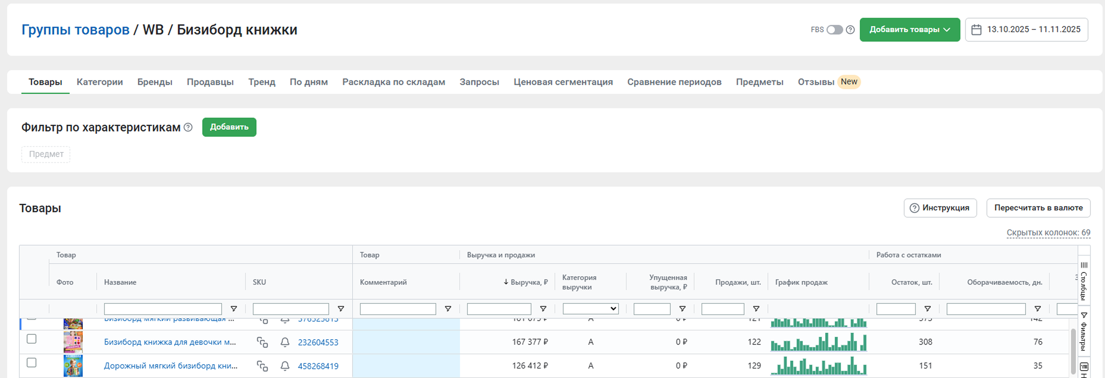 Сгруппируем товары по предметам и покажем суммарную статистику по ним. Отчет поможет быстро определить, какая ниша в группе является локомотивом, а из какой можно выходить. С помощью этой вкладки удобно работать как со своими товарами, так и с товарами конкурентов.
