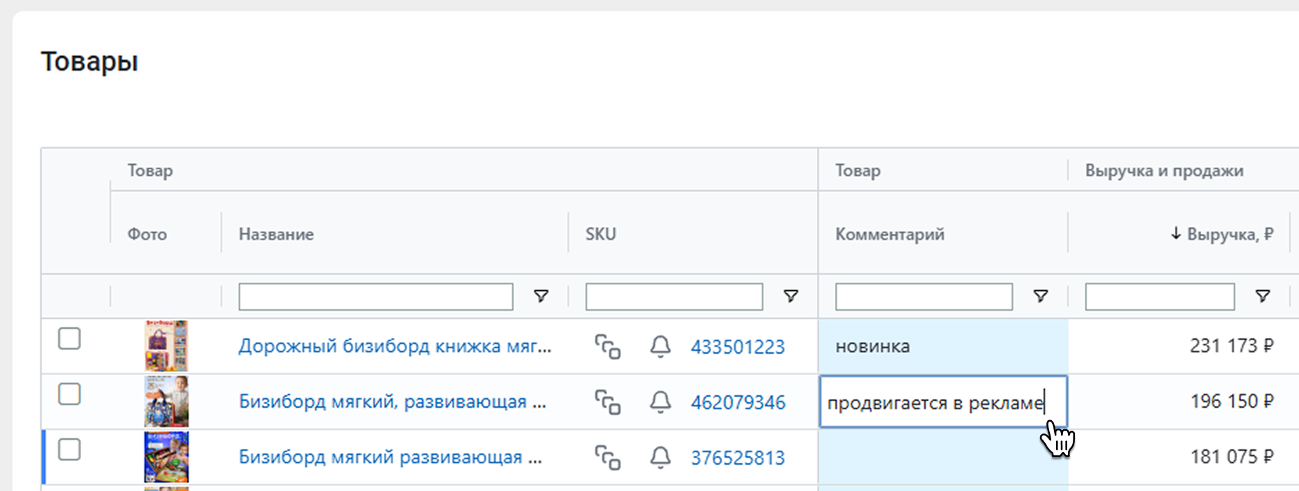 В этой вкладке можно добавлять к товарам комментарии. Например, вы можете указать артикулы или информацию об актуальности своих товаров. Или оставлять пометки о товарах конкурентов.