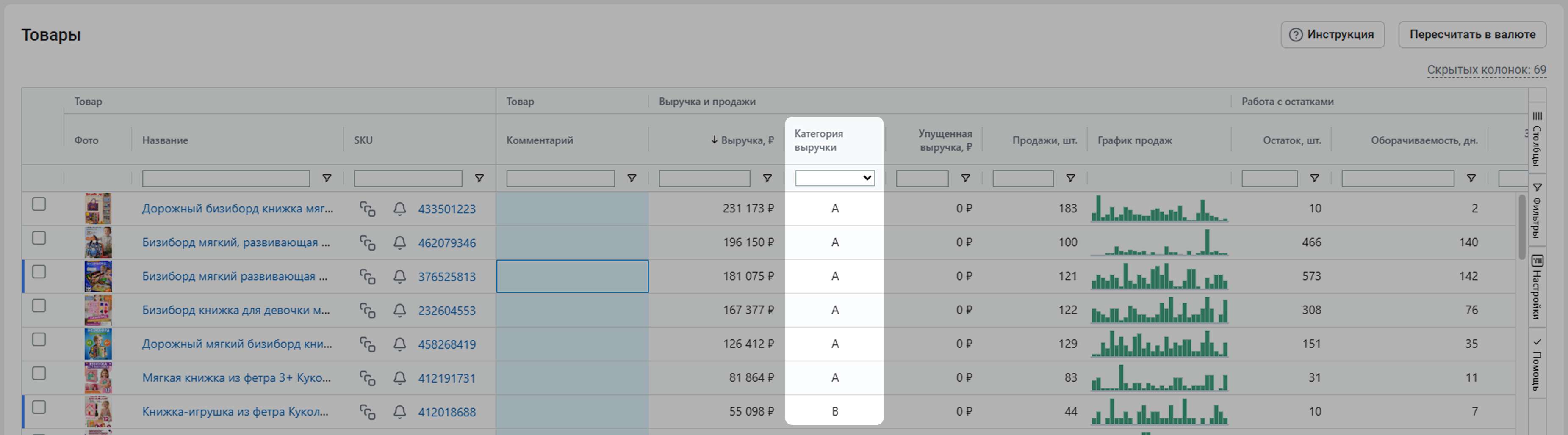 Еще в этом отчете показываем, к какой категории выручки относится каждый товар из группы: А, В или С. Группа A – товары, которые приносят ~80% выручки, группа B – ~15% выручки, группа C – оставшуюся часть выручки. Вы можете отсортировать таблицу по этим группам, чтобы эффективнее анализировать товарную матрицу.