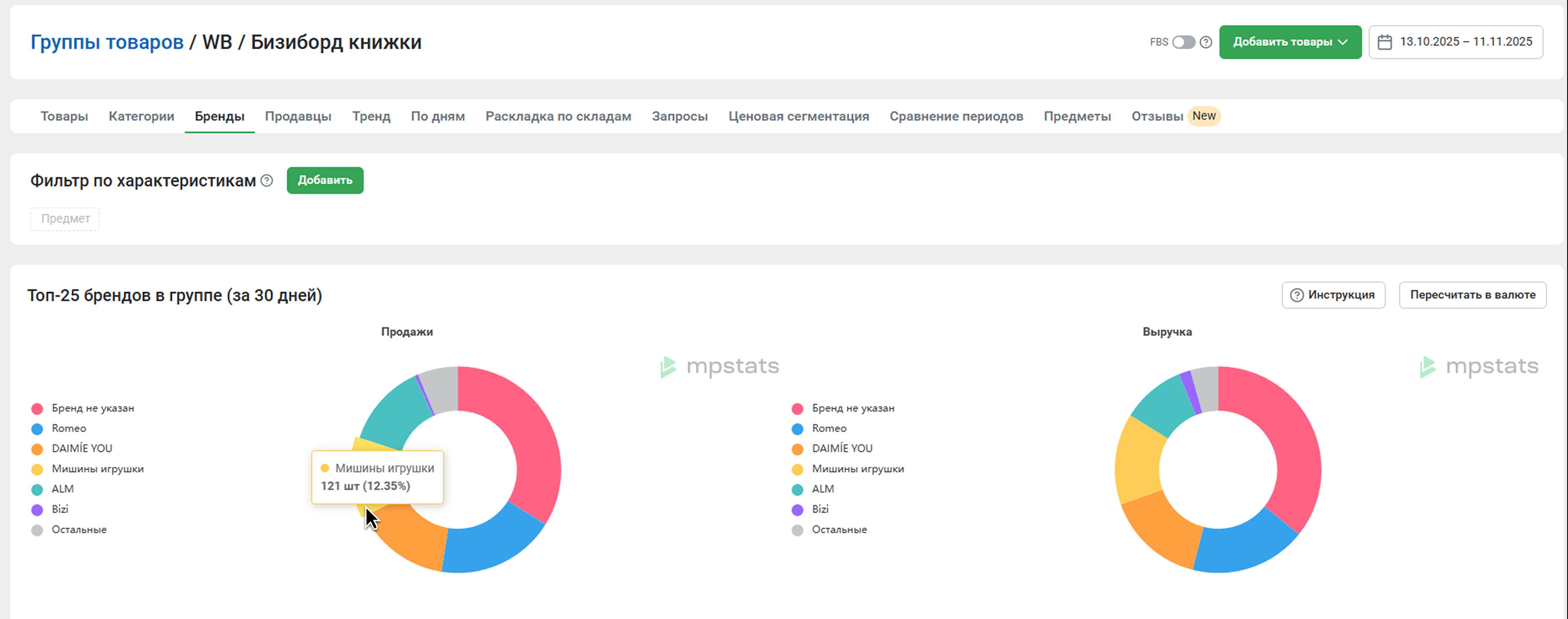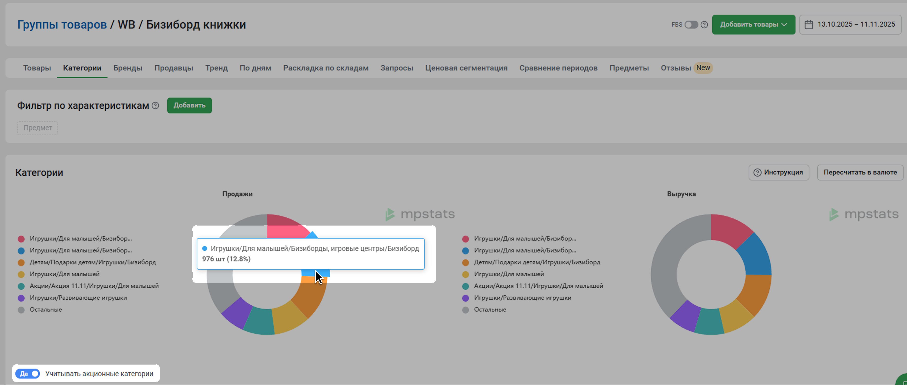 Отчет поможет понять, в каких категориях представлены товары в группе и где больше или меньше товаров. Если вы наведете мышку на диаграмму, увидите долю продаж и выручки в конкретной категории товаров в Группе.