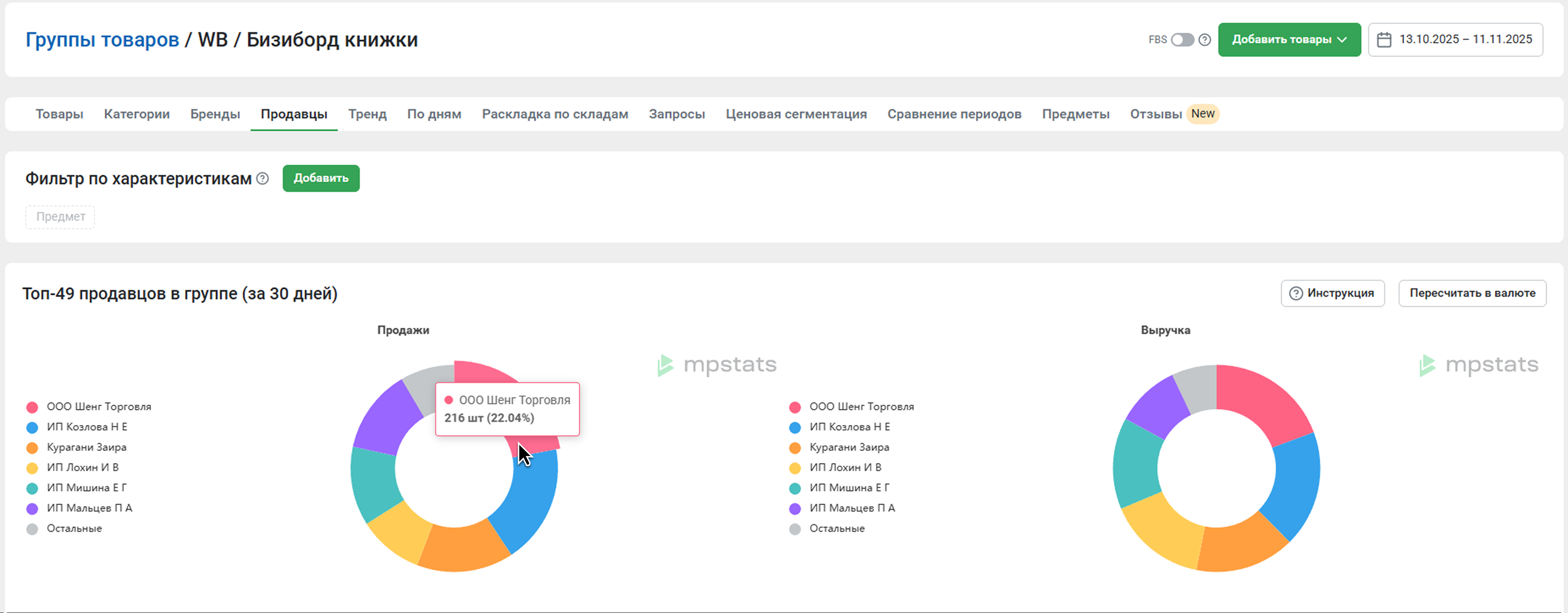 Диаграмма показывает, какая доля в процентном соотношении и по количеству проданных товаров приходится на продавцов в нише. С ее помощью можно выявить и исследовать потенциальных конкурентов.