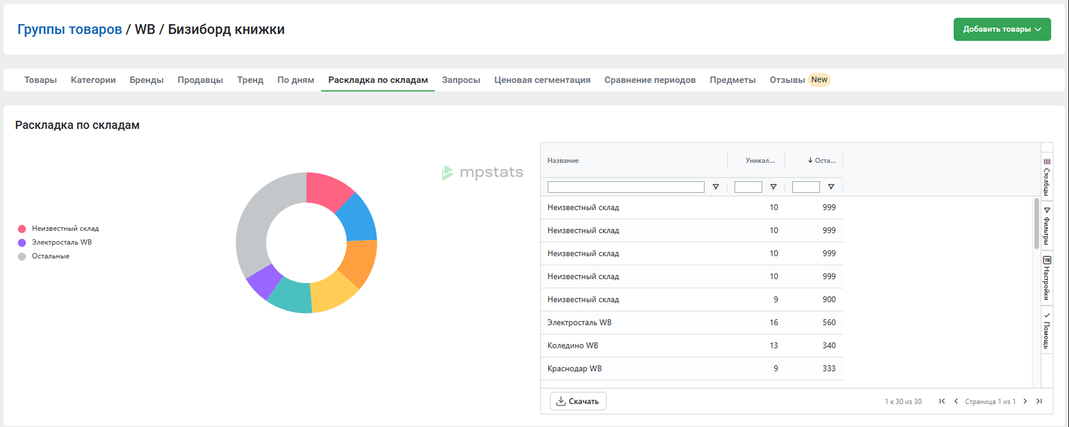 Отчет по товарам – это сводная таблица за выбранный период по анализируемому предмету. Здесь собраны основные данные по товарам из предмета, включая финансовые показатели (процент выкупа, цена, продажи). Более подробно от отчете можно прочитать в статье Товары.