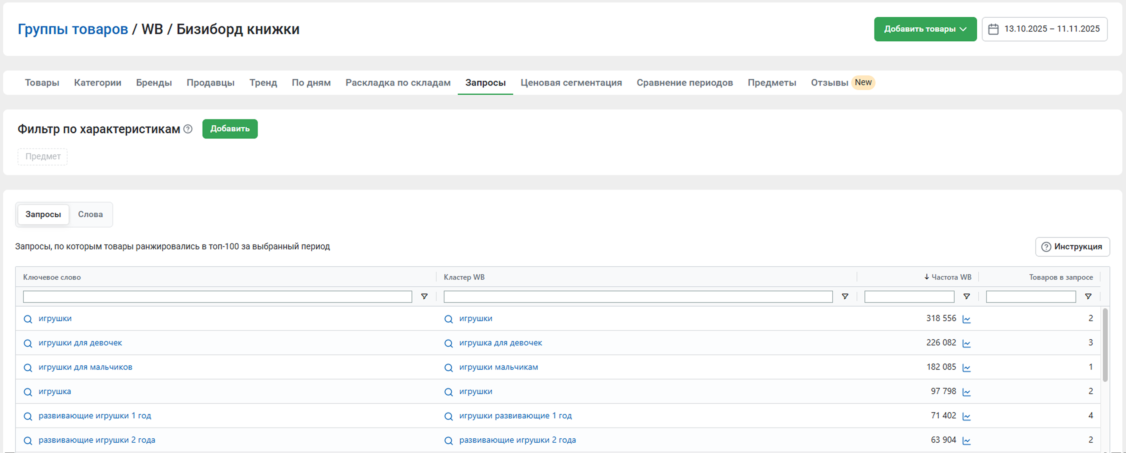 Отчет покажет список наиболее популярных запросов, по которым пользователи искали товары из исследуемого предмета. Во второй вкладке будет список слов, из которых состояли эти запросы. Инструмент покажет, какие слова стоит включить в описание товаров при выборе этого предмета, какие характеристики товаров интересуют пользователей чаще всего (например, «платье женское» или «платье теплое»), какие бренды ищут чаще всего и т. п.