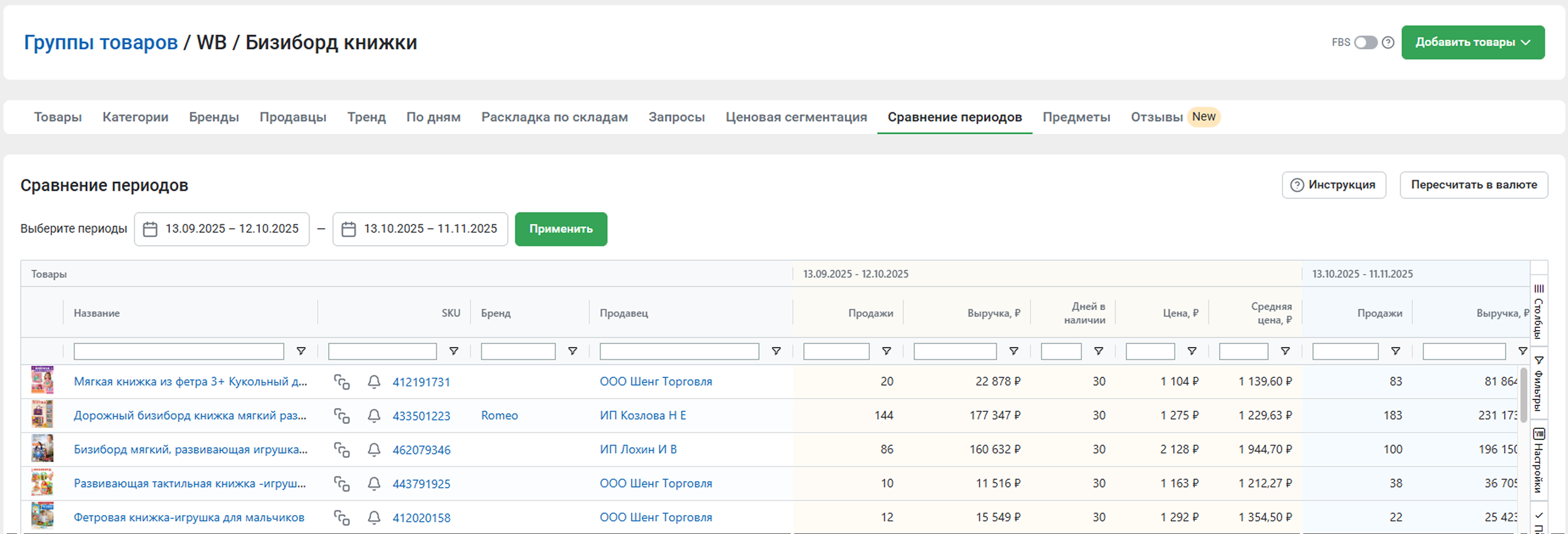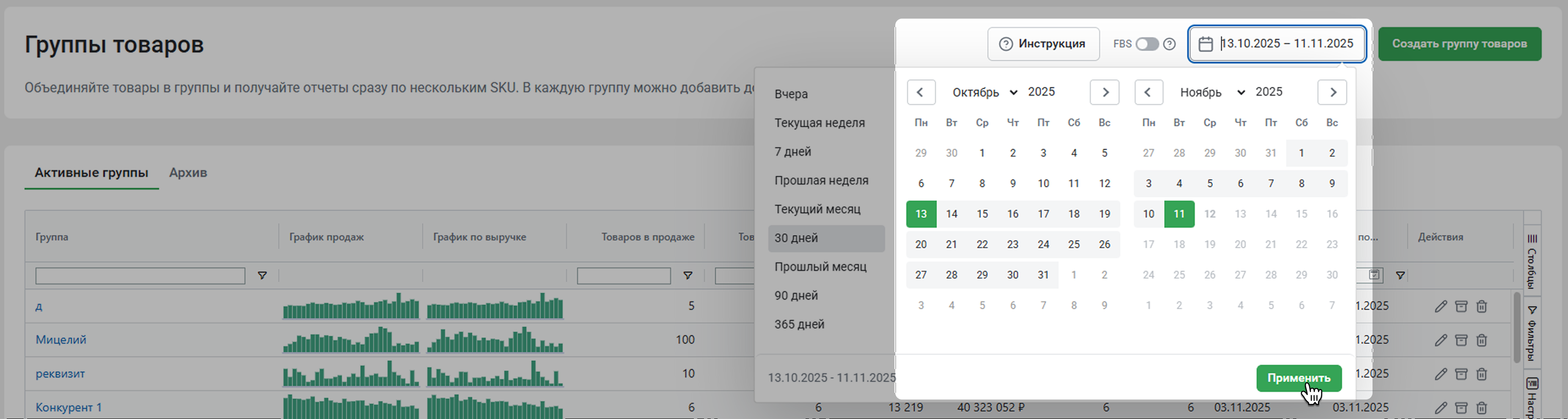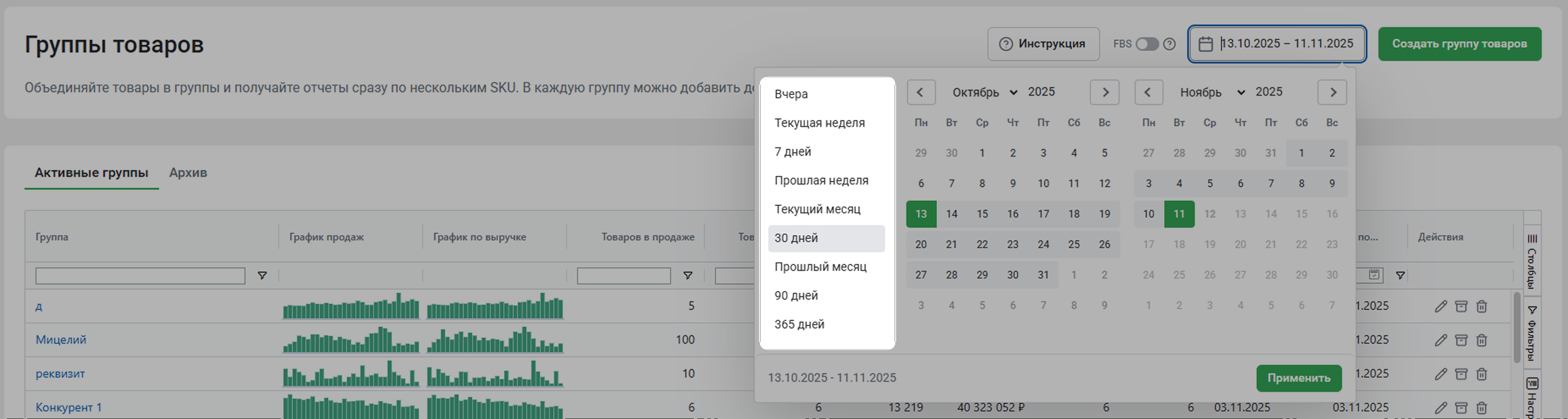 В общем списке групп и в конкретном отчете вы можете менять настройки – выбрать вид учитываемых в отчете складов (по FBO или FBS) и время анализа данных.