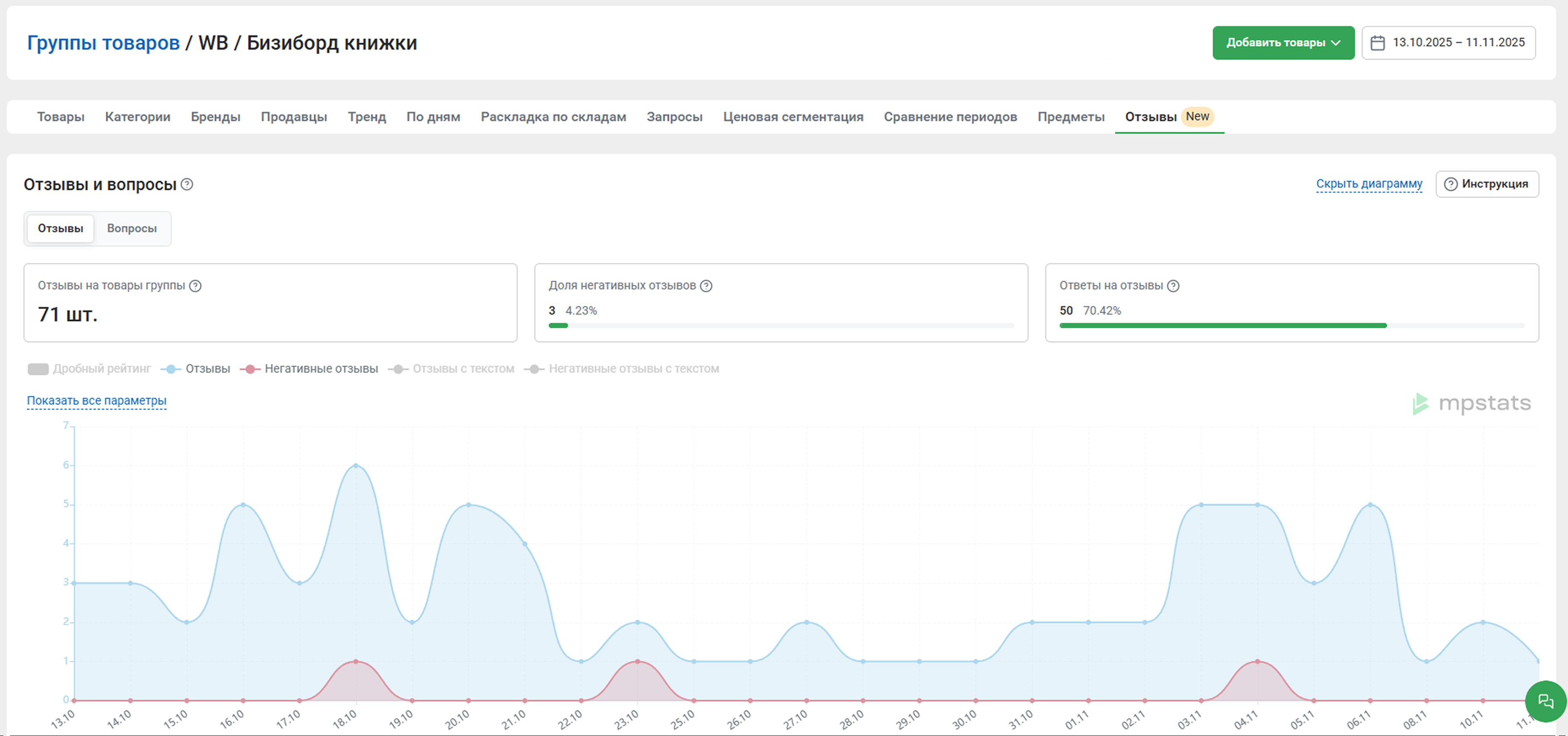 В отчете Отзывы собрали все отзывы и вопросы, которые оставляли покупатели в карточках товаров. Изучайте ожидания и возражения покупателей, применяйте их в работе в своих карточках. Подробнее рассказали в статье Отзывы.