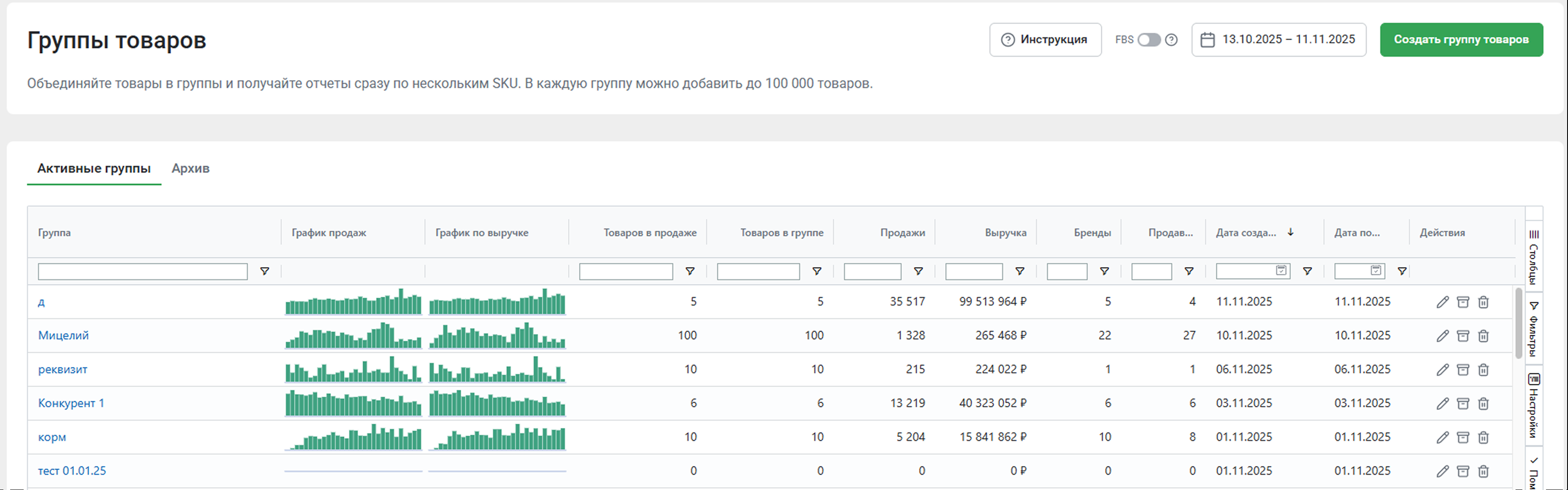 Количество групп товаров не ограничено, и в каждую из них можно добавить до 100 000 товаров (SKU). С каждой группой можно взаимодействовать – получать отчеты по товарам из группы, изменять группу и перечень товаров в ней.