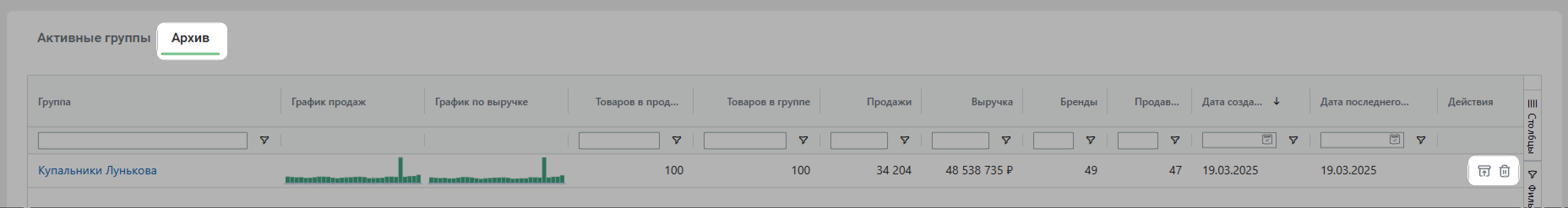 Группы, которые не нужны вам сейчас, но могут понадобиться в будущем, можно отправить в Архив. Здесь тоже будут все основные показатели. Группу из Архива можно восстановить или удалить. Если вернуть группу в Активную, информация по ней будет доступна за все дни – включая те, пока она была в архиве.