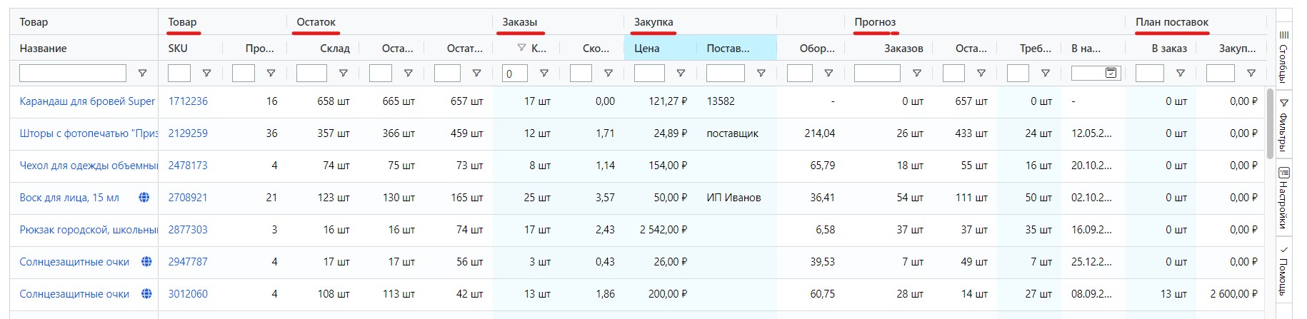 Отчет – это таблица с рассчитанными показателями для каждого SKU. Для удобства восприятия столбцы таблицы объединены в группы: Товар, Остаток, Закупка, Заказы, Прогноз, План поставок.