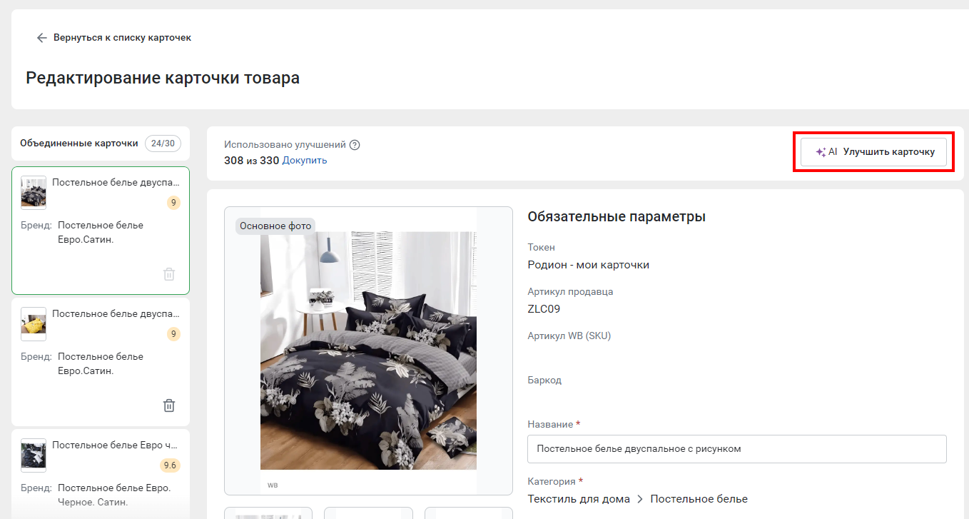 В инструменте Мои карточки откройте страницу нужной карточки. Нажмите Улучшить карточку. Искусственный интеллект будет опираться на предмет товара, фотографии и текущее наполнение карточки. Еще он проанализирует самые популярные товары в нише, чтобы найти подходящие запросы.