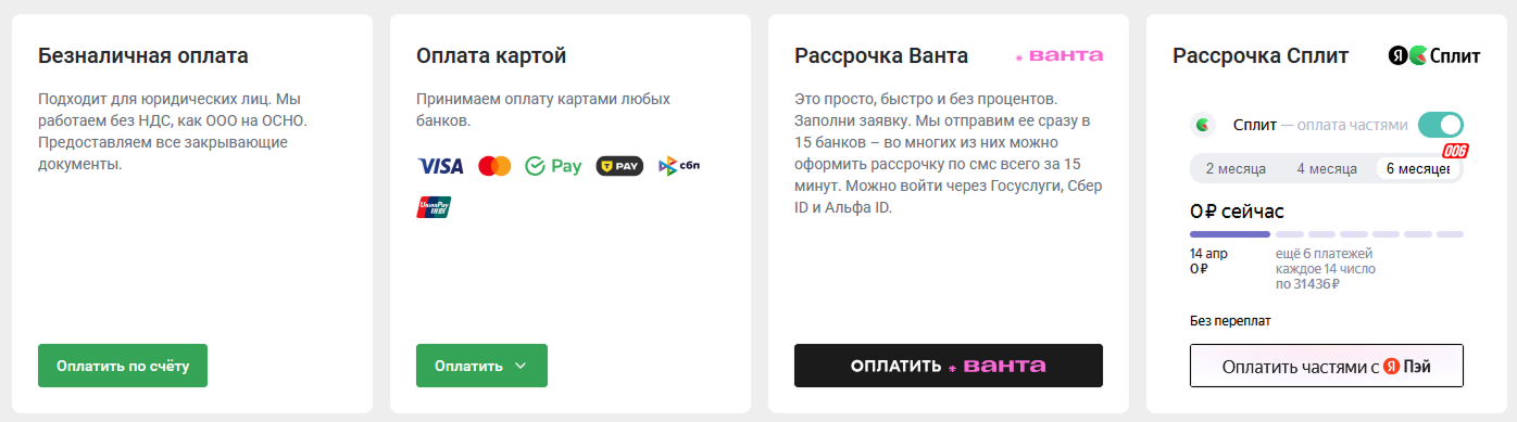 Выберите подходящий вам способ – можно оплатить безналично через банк (для юридических лиц), банковской картой, в рассрочку и через Яндекс Пэй.
