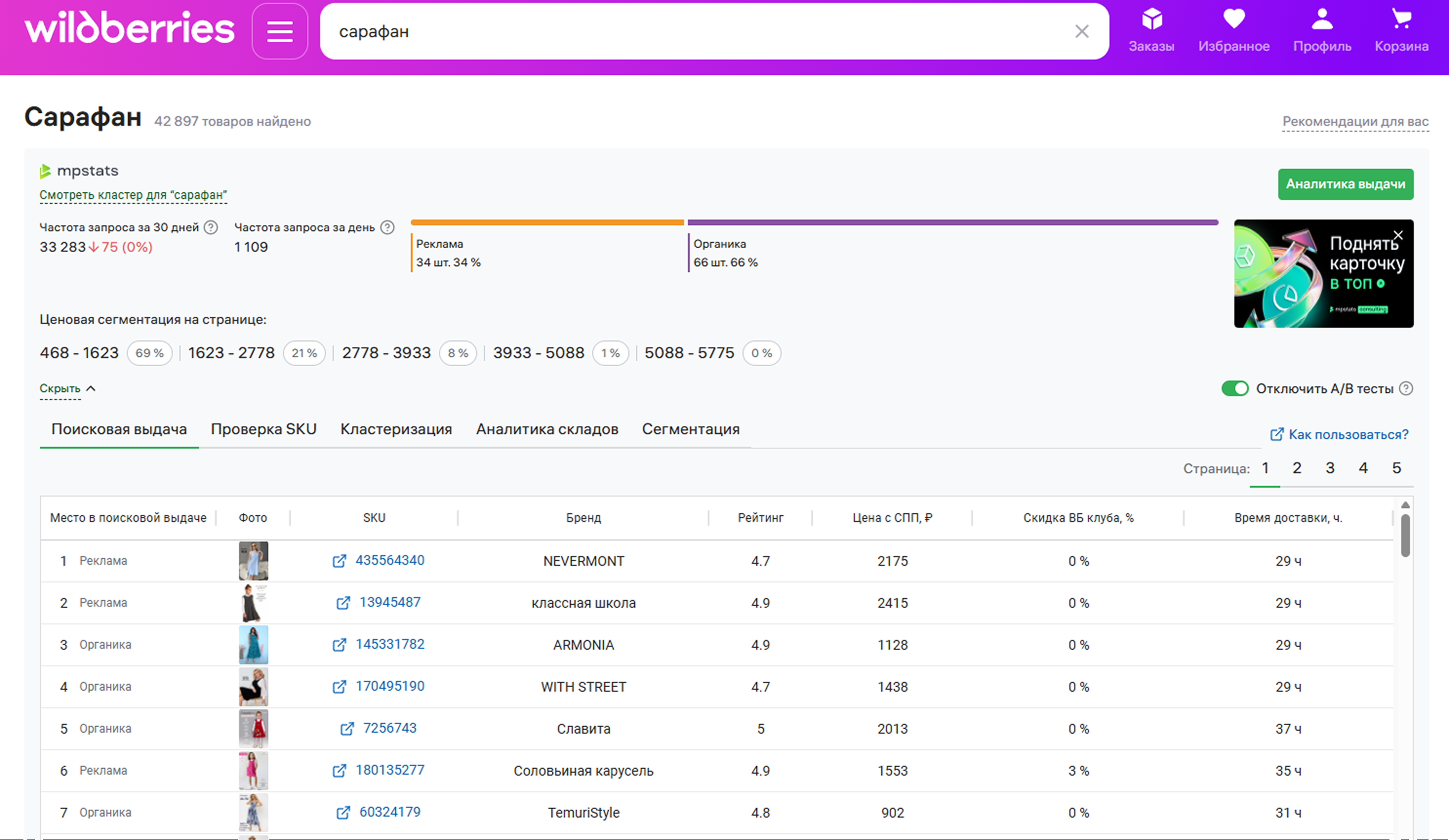 В этой вкладке можно посмотреть, на каких позициях по введенному запросу товар находится в разных регионах. Это поможет понять, на какие склады лучше отгружать товар.