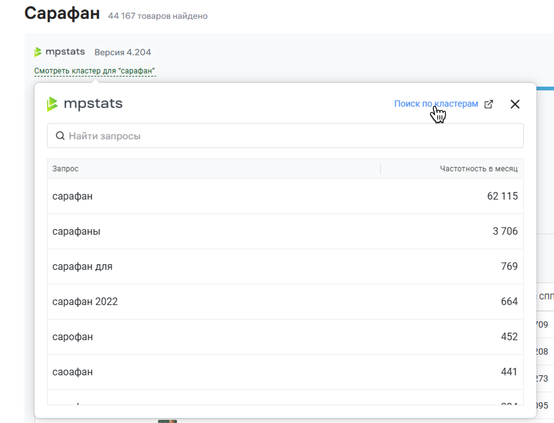 Здесь же можно увидеть, к какому кластеру относится запрос. Нажмите Смотреть кластер, чтобы узнать, какие еще запросы относятся к этому кластеру. Откроется список запросов и их частотность в месяц. Вы можете найти интересующий вас запрос в строке поиска.