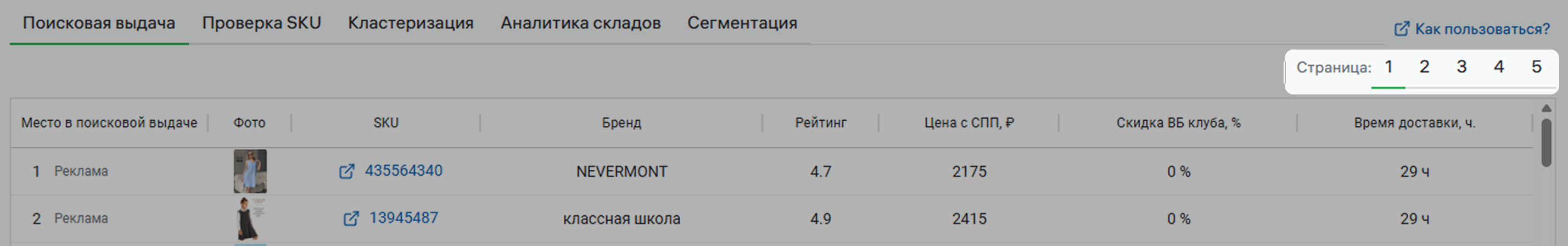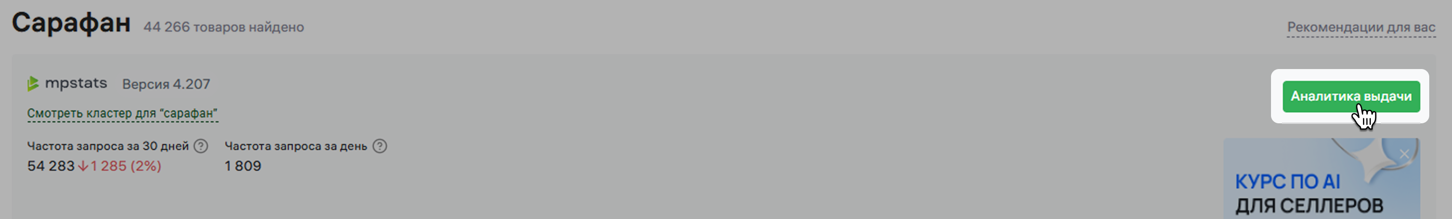 Если вам нужна более полная информация о товарах поисковой выдачи, нажмите Аналитика выдачи. Вы попадете в инструмент Поиск по SKU. Узнать о нем подробнее можно в статье Поиск по SKU.