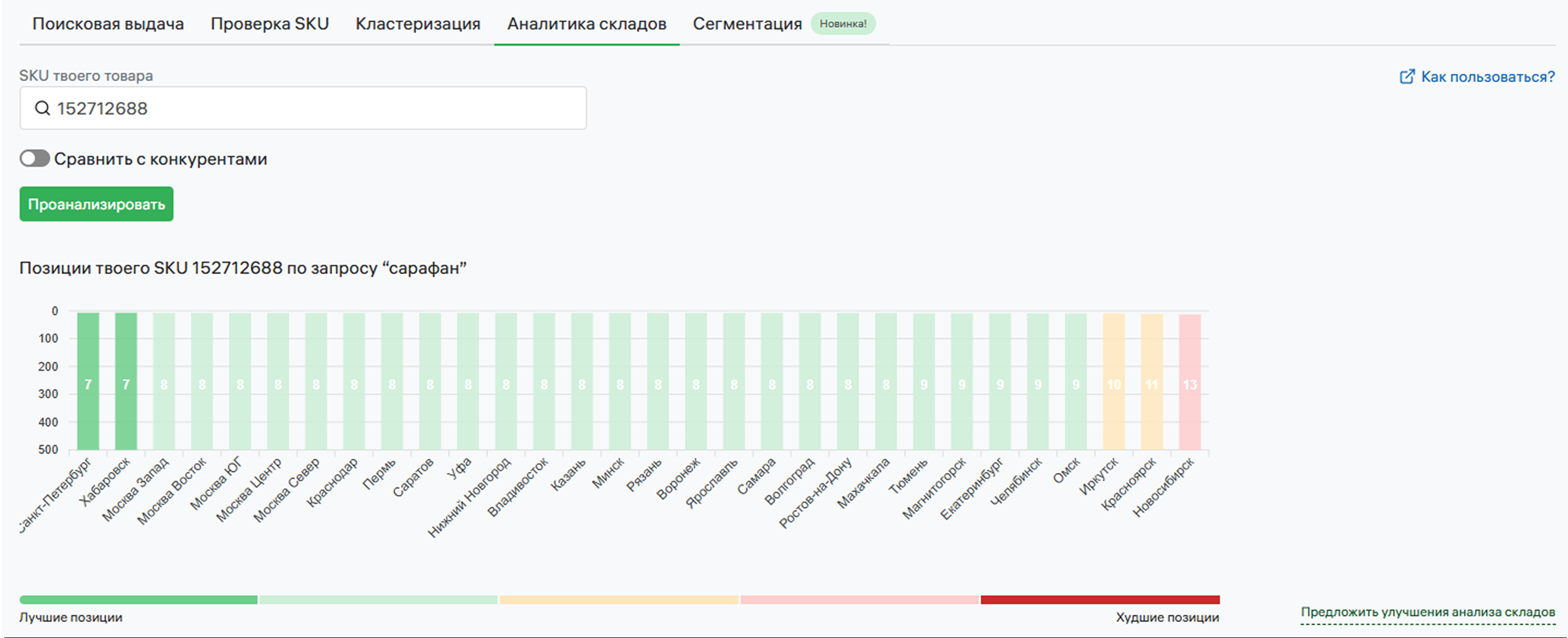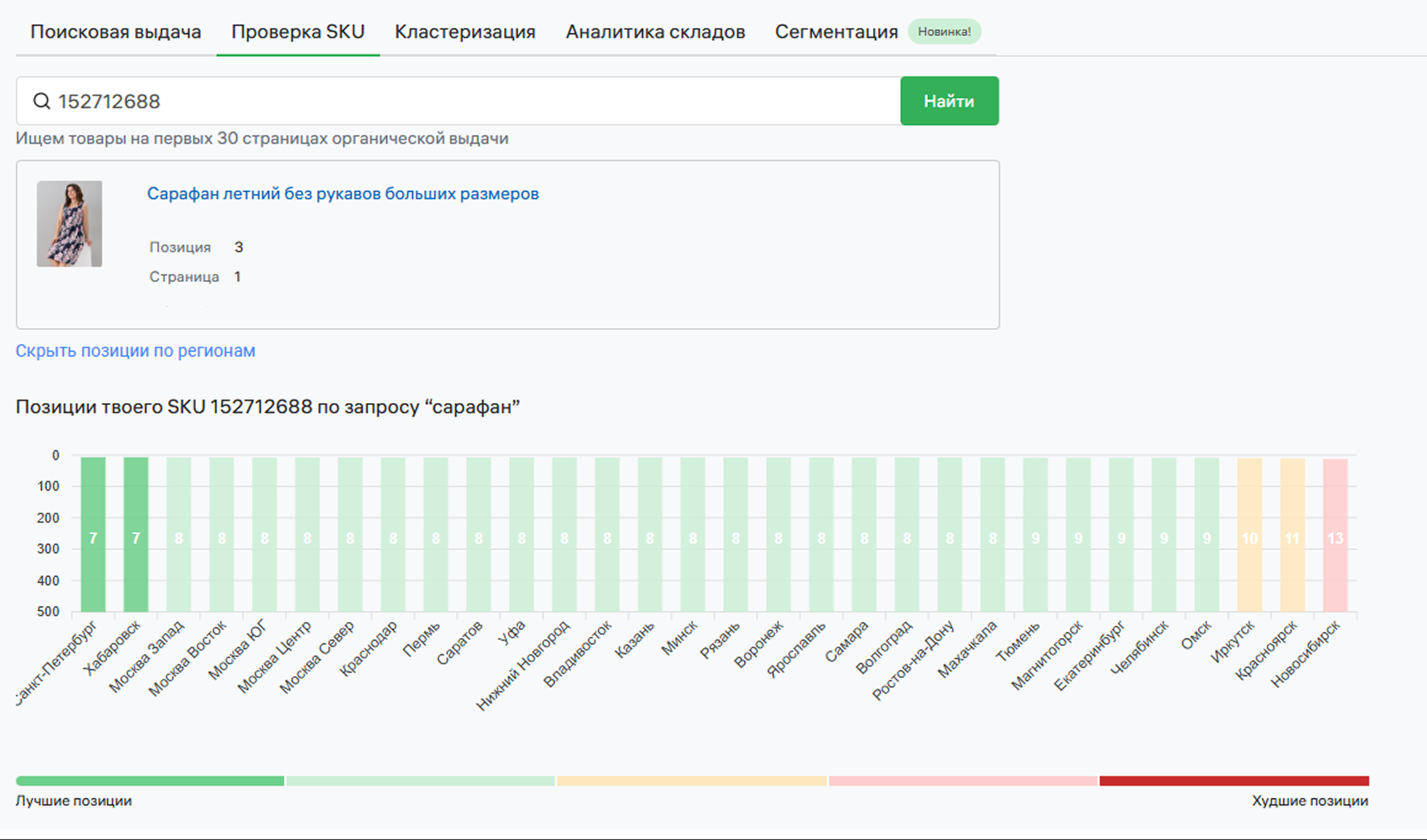 Введите SKU и нажмите Проанализировать. Вы увидите график позиций по 23 регионам.