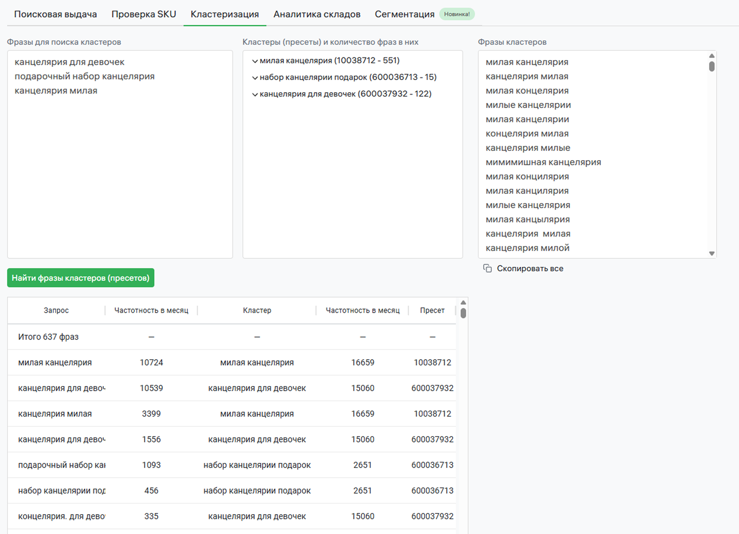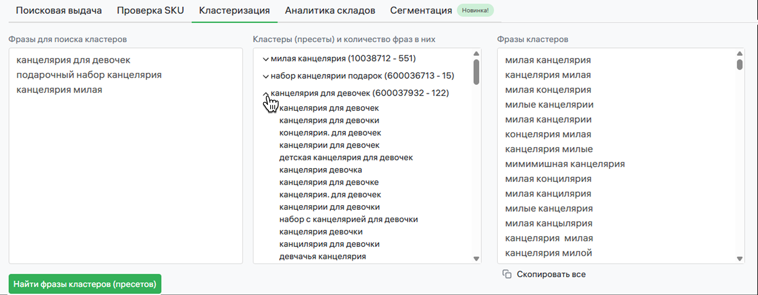 В этой вкладке вы можете проверить, к каким кластерам и пресетам относятся интересующие вас запросы. Введите список запросов и нажмите Найти фразы кластеров (пресетов).