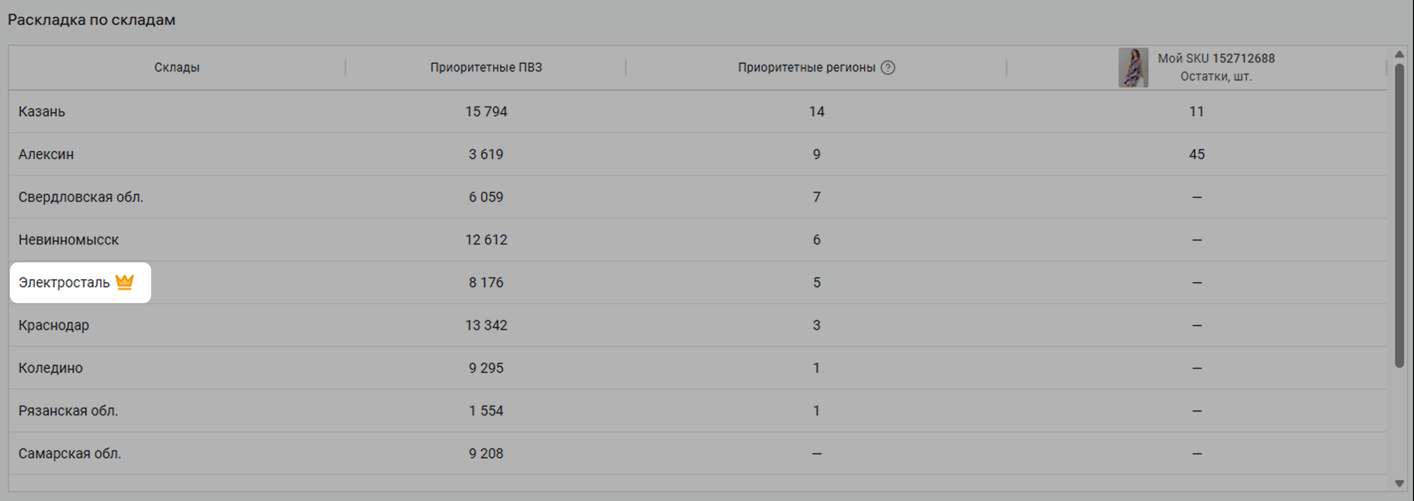Склад, с которого продается больше всего товаров из топ-100 по введенной фразе, отмечен значком короны.