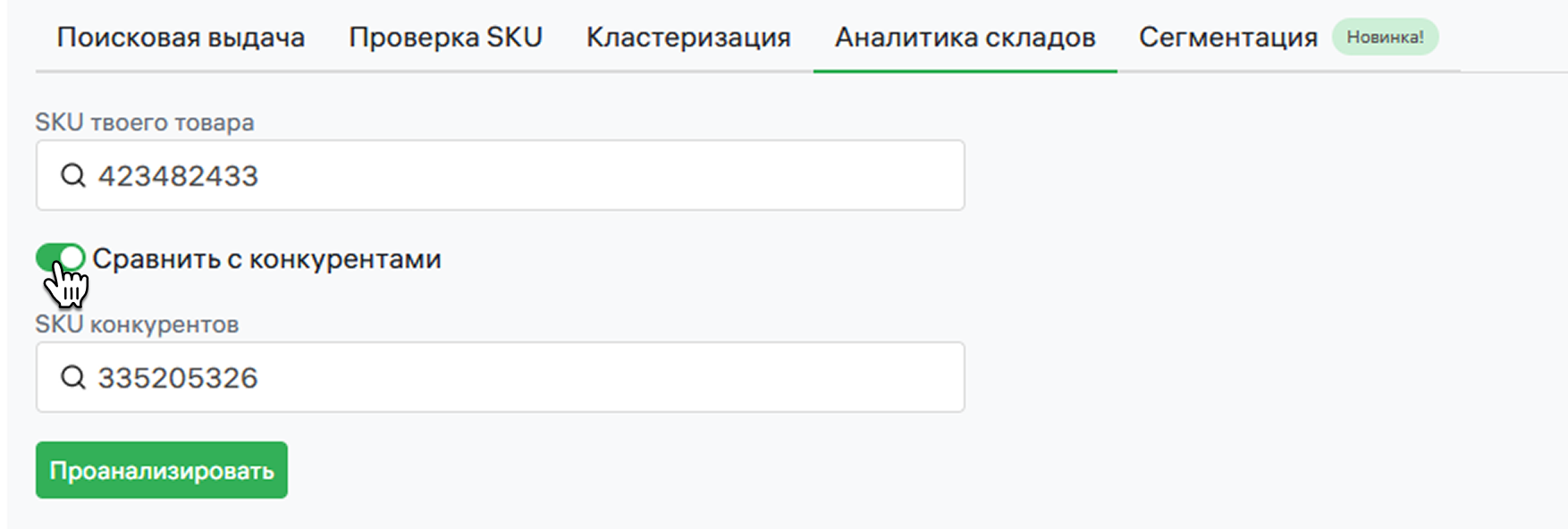 Если вам нужно сравнить параметры своего товара с другими продавцами, сделайте активным переключать Сравнить с конкурентами и введите интересующие вас SKU. Нажмите Проанализировать.