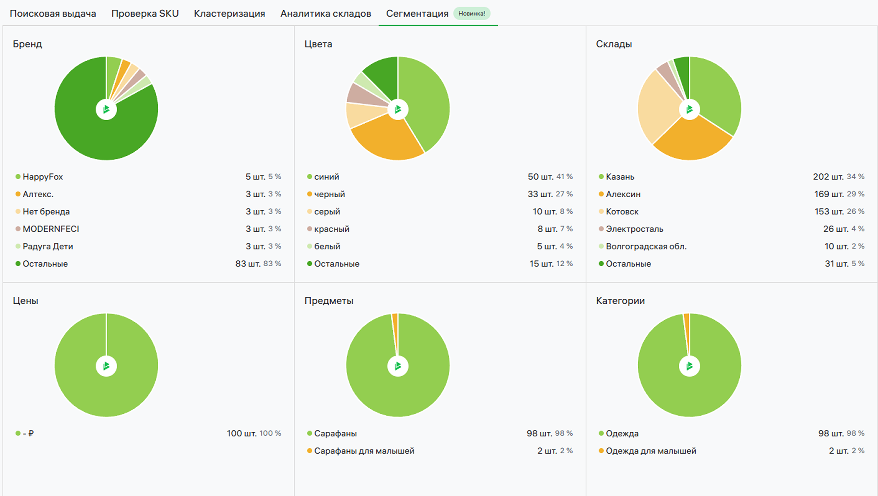 В этой вкладке показываем, как распределяются товары из топ-100 поисковой выдачи по: