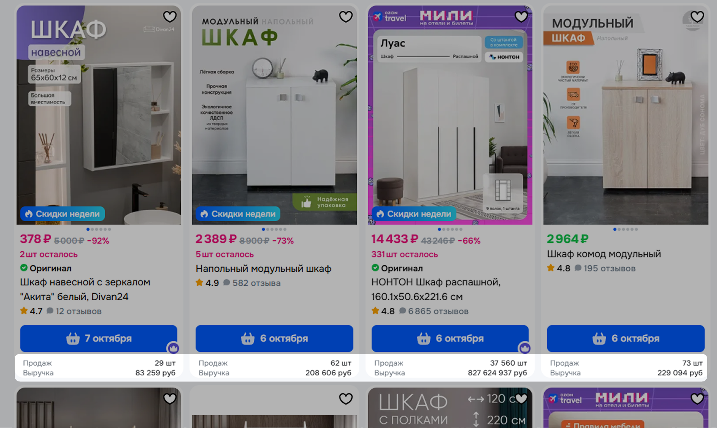 Покажем, как распределяются цены на товары на этой странице поисковой выдачи. Можно посмотреть, какой ценовой диапазон самый популярный по этому запросу. Например, на скриншоте видно, что самая популярная цена на шкафы находится в диапазоне от 378 ₽ до 8068 ₽.