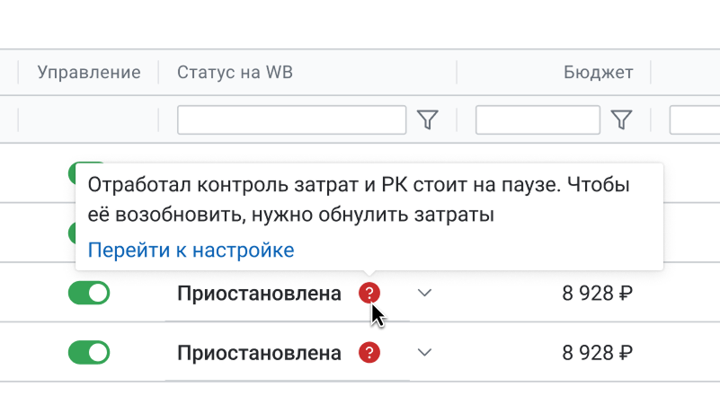 Если контроль затрат сработает и приостановит кампанию, вы увидите предупреждение об этом в общем списке кампаний. Нажмите Перейти к настройке, чтобы сбросить затраты и задать новое условие для автобиддера.