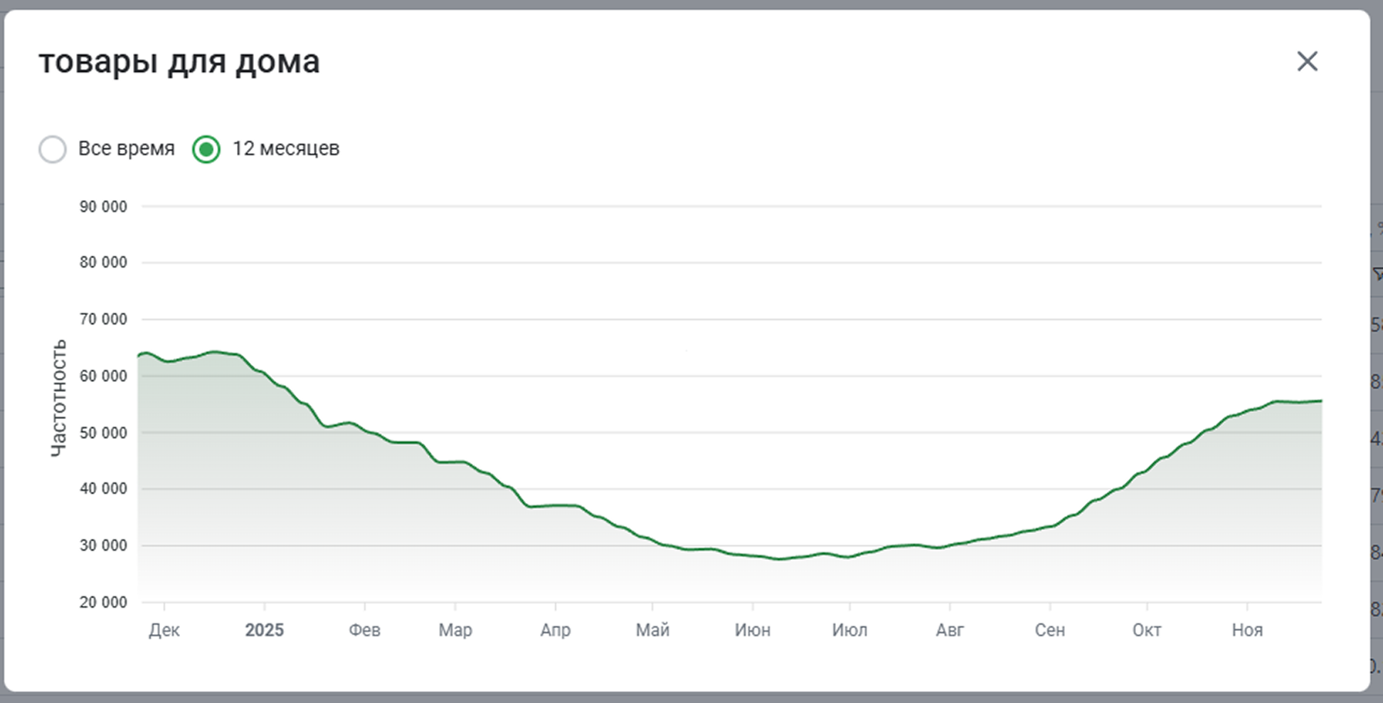 График покажет, как менялась частота запросов в пресете за разные периоды – 12 месяцев или за все время. Можно будет сравнить динамику различных пресетов между собой и выбирать наиболее подходящие кластеры.