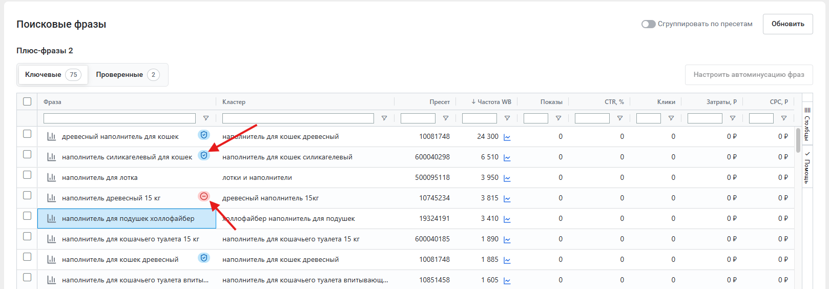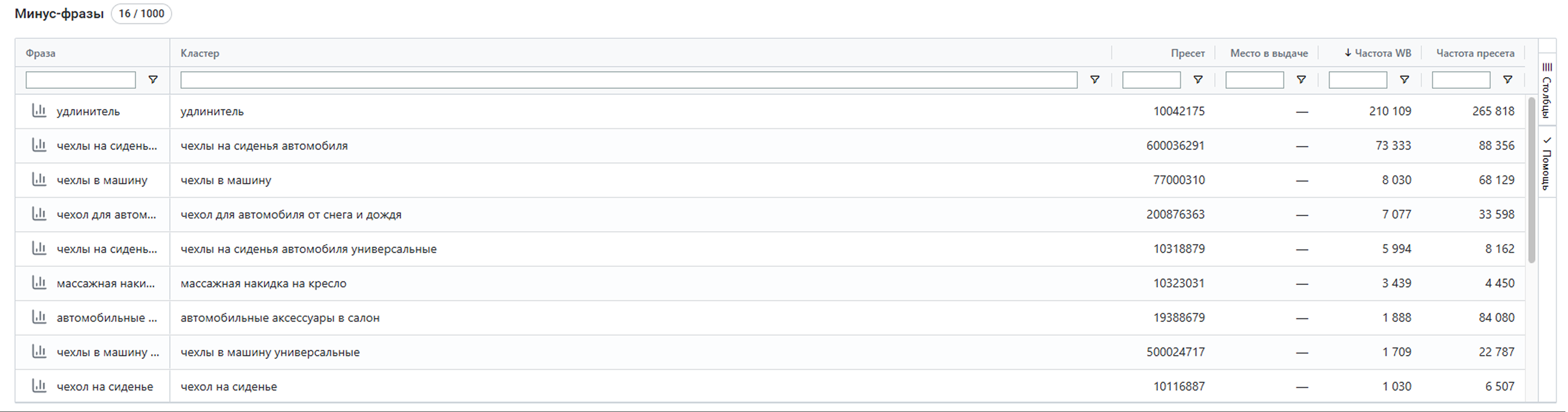 Во вкладку Ключевые попадают фразы и кластеры, которые передает нам Wildberries.