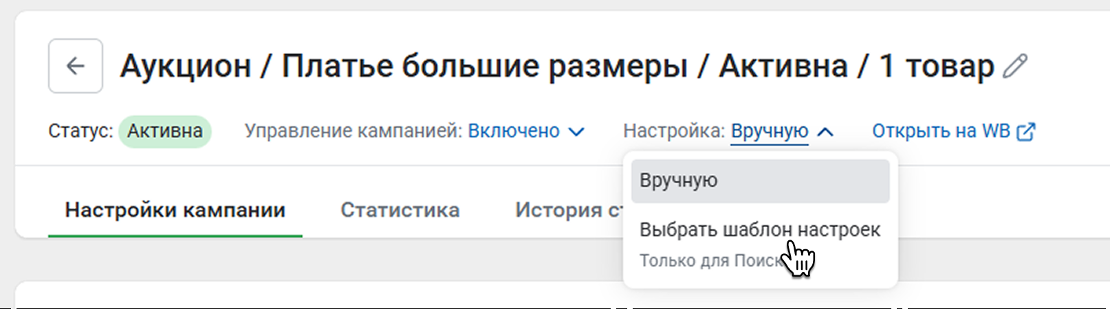 Чтобы перейти в этот режим, в правой части экрана откройте выпадающий список и нажмите Выбрать шаблон настроек. О том, какие есть шаблоны и как они работают, рассказали в отдельной статье Автобиддер: шаблоны настроек (WB).