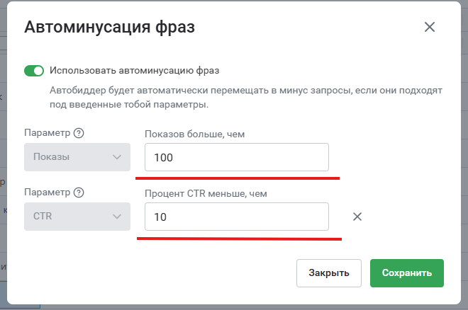 Чтобы использовать фразу в рекламной кампании Автобиддера, нажмите Применить фразу.