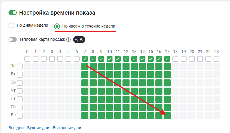 Показы можно настроить во Все дни, только Будние дни или только Выходные дни. Для этого выберите нужный интервал под сеткой.