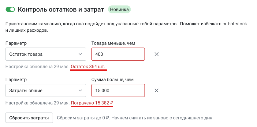 Автобиддер может приостановить кампанию в зависимости от потраченной на нее суммы или количества остатков товара. Эта настройка поможет контролировать бюджет рекламной кампании и избежать out-of-stock.