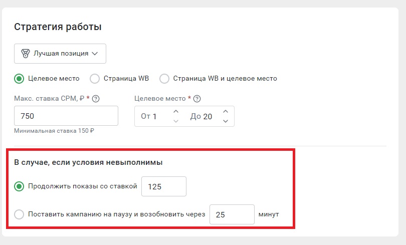 Иногда условия могут оказаться невыполнимыми – например, биддер не может занять целевые места даже при максимальной ставке. Тогда биддер продолжит показы по вашей минимальной ставке в течение 15 минут, а затем снова попытается выполнить условия.
