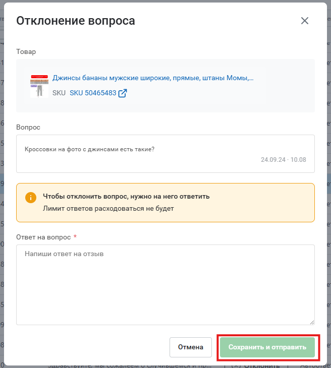 При работе с вопросами вам иногда придется иметь дело со спамом. Инструмент позволяет отклонять эти вопросы, чтобы не отвлекать внимание. Для этого нужно найти столбец Отклонение и нажать кнопку Отклонить напротив соответствующего вопроса.