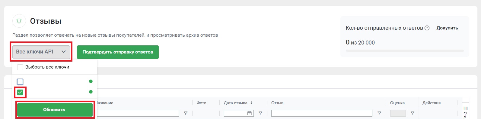 Выберите токен, на товары которого хотите видеть отзывы. Отметьте все токены галочками и нажмите Обновить.