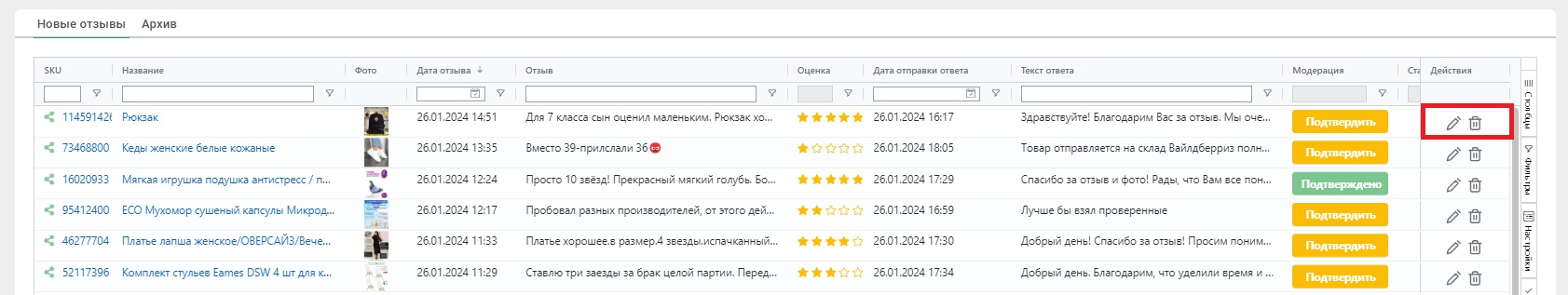 В Новых отзывах собран список всех ваших отзывов, ожидающих ответа. Инструмент позволяет отслеживать статусы ответов на отзывы, проверять ответ, сформированный сервисом, и редактировать его, а также подтверждать ответ перед отправкой.
