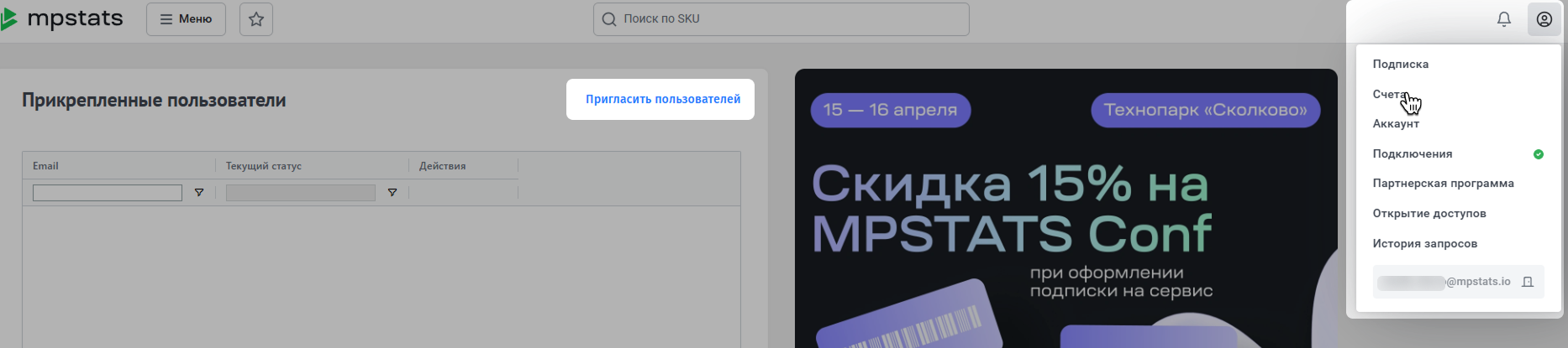 2. Перейдите в Аккаунт → раздел Счета. Нажмите Пригласить пользователей.