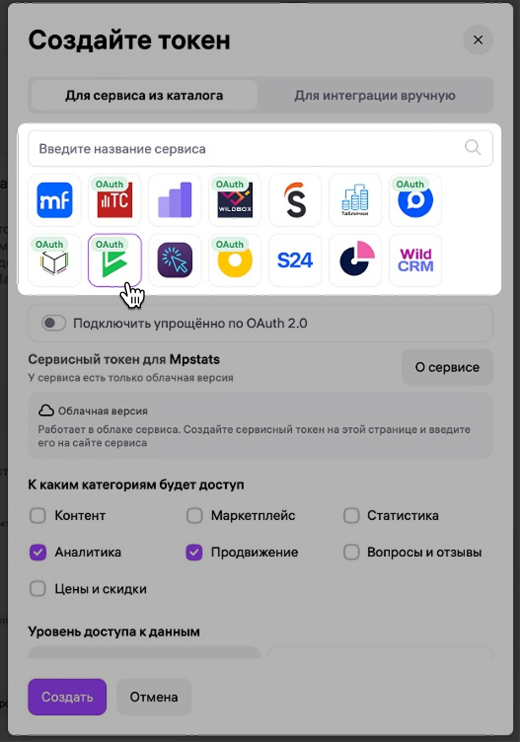Во вкладке Для сервиса из каталога введите в строку поиска MPSTATS. Нажмите на иконку MPSTATS.