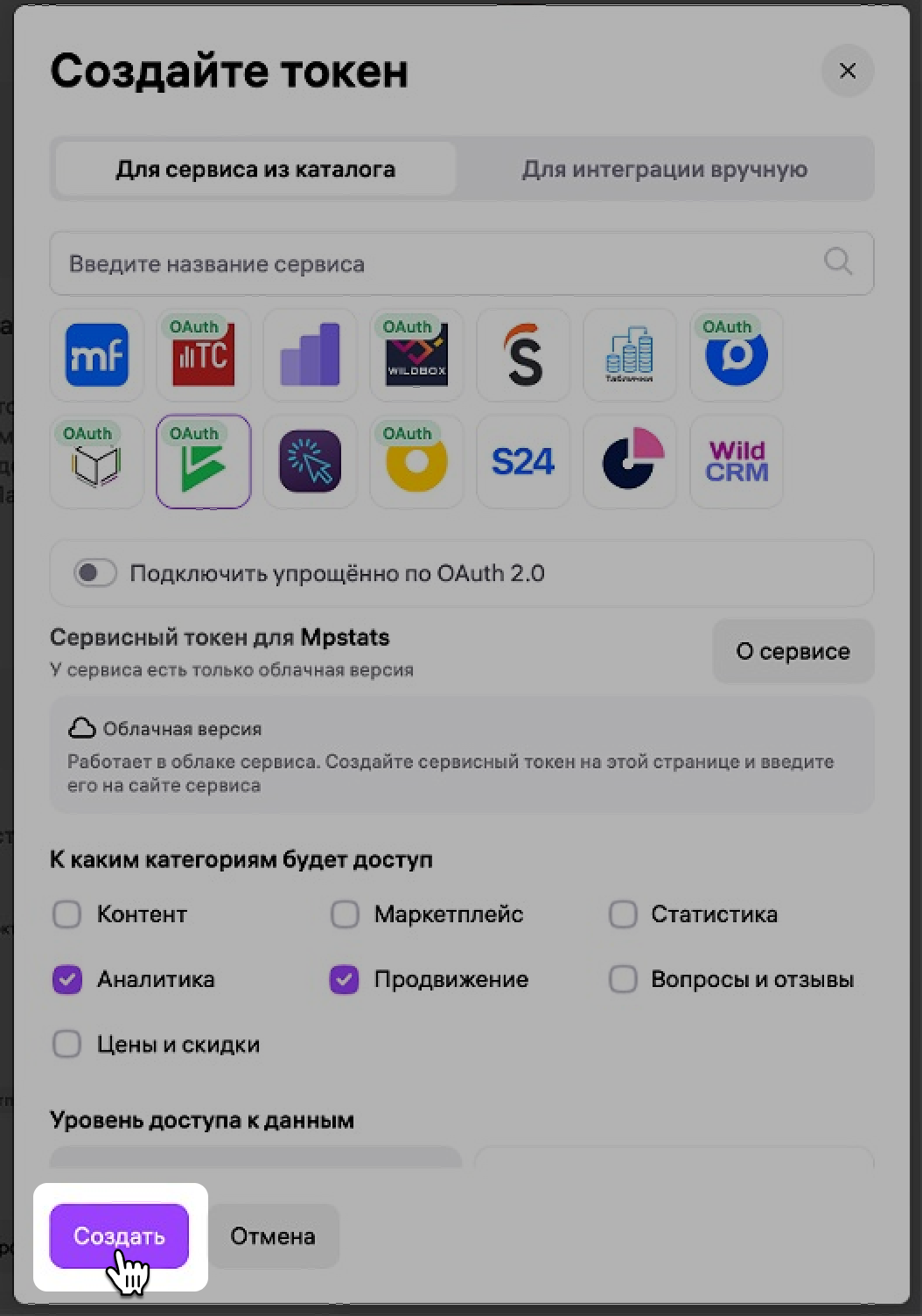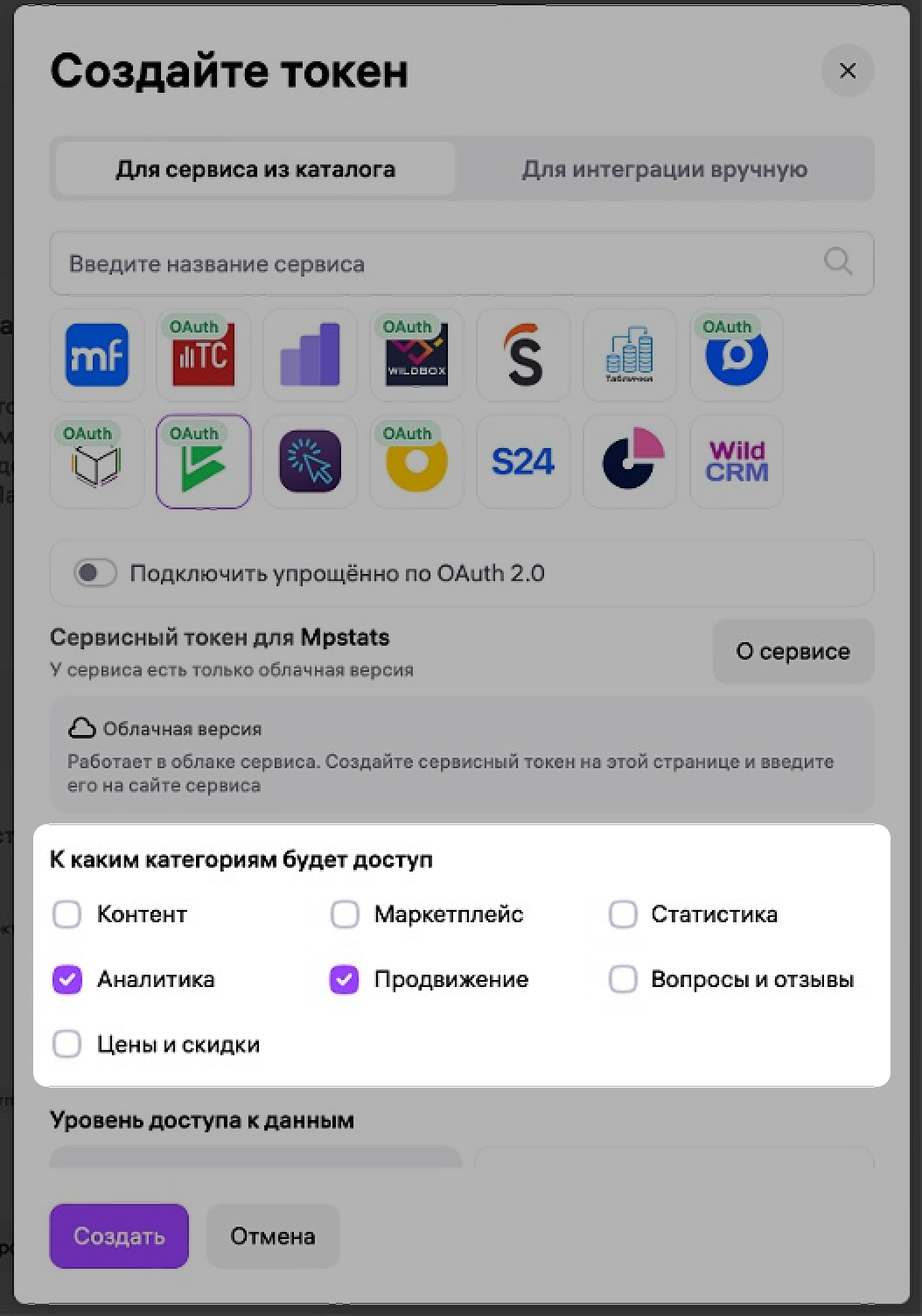 Отметьте галочками категории, к которым нужен доступ: Продвижение, Аналитика.
