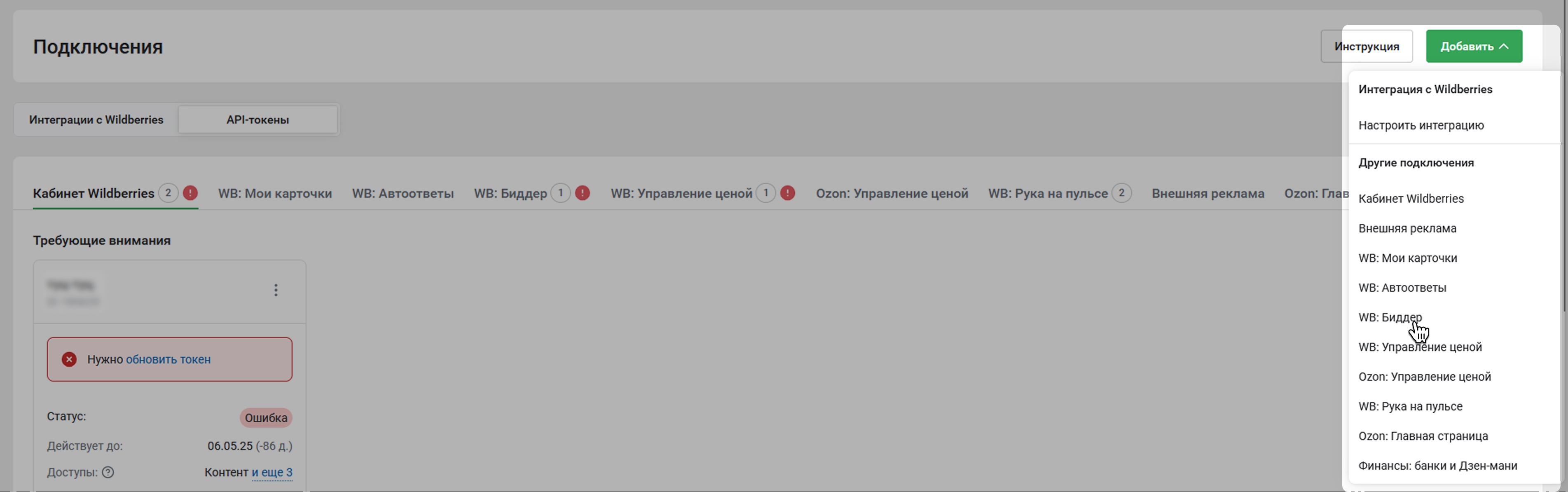 В разделе Подключений можно проверить статусы всех добавленных подключений. Там же их можно редактировать и удалять. Если токен не загрузился, система выдаст ошибку и предложит сгенерировать и обновить токен.
