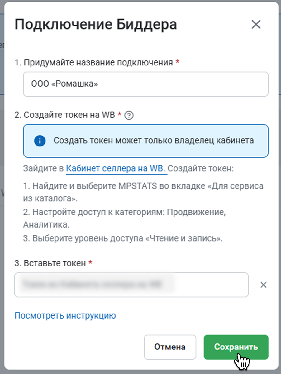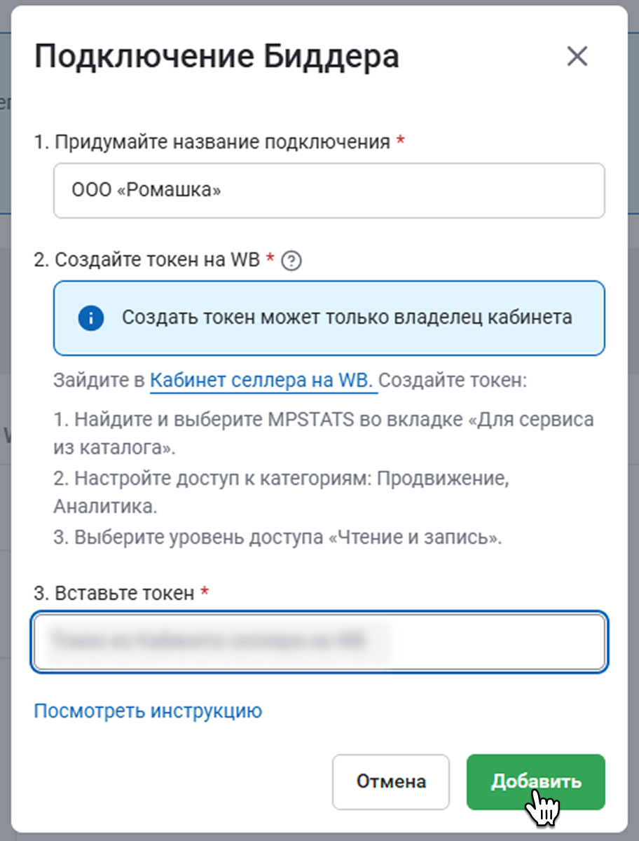 Введите название подключения и скопированный API-токен из Кабинета селлера на WB. Нажмите кнопку Добавить.