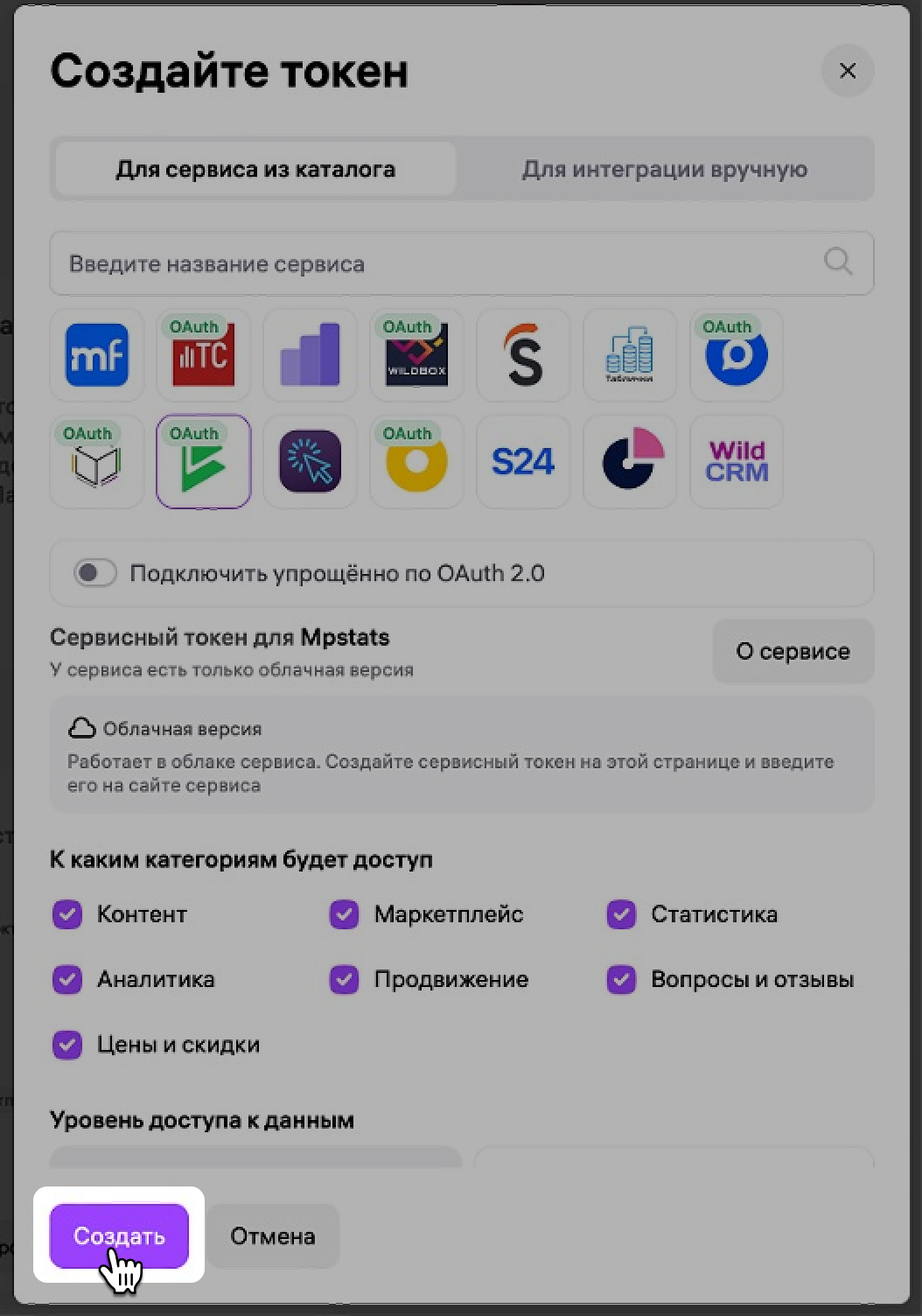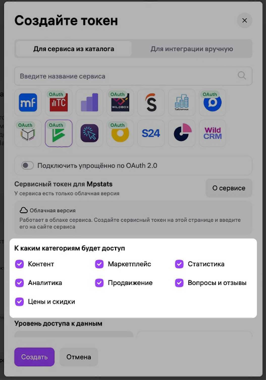 Отметьте галочками категории, к которым нужен доступ: Контент, Маркетплейс, Статистика, Аналитика, Продвижение, Вопросы и отзывы, Цены и скидки.